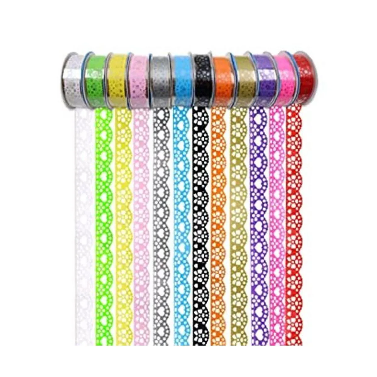 Varios colores: 12 rollos de cinta adhesiva de encaje en diferentes colores vibrantes: morado, amarillo, naranja, blanco, negro, oro, plata, rosa claro, azul, rosa oscuro, verde, rojo.