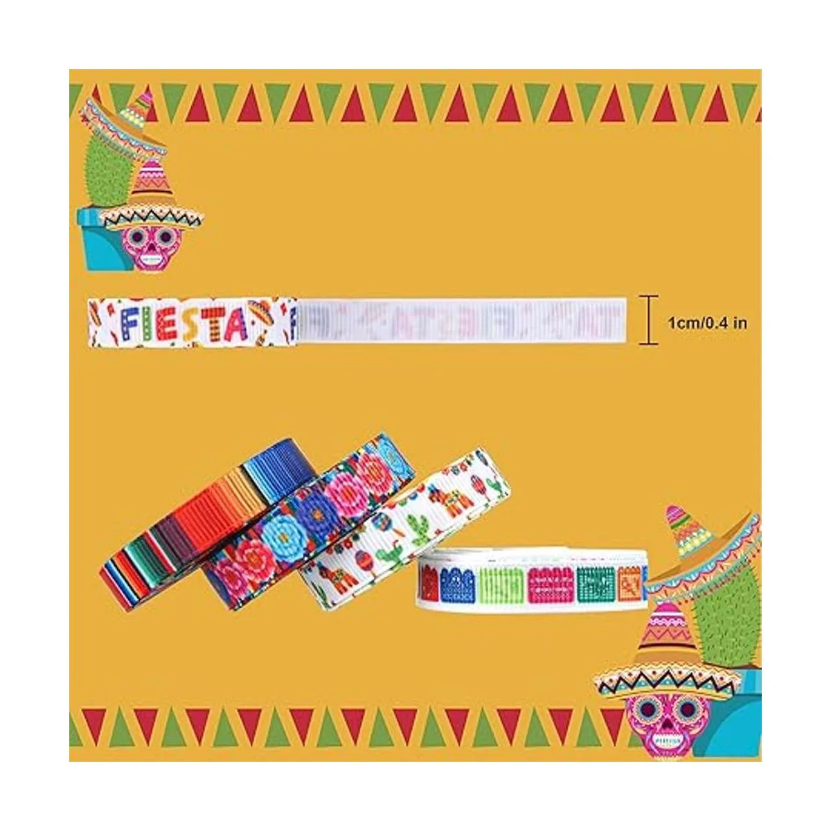 Impresión de patrones vivos: el excelente proceso de impresión garantiza los espléndidos colores y la integridad de los patrones de las cintas temáticas mexicanas; las cintas de fiesta mexicana tienen diseños gráficos únicos y combinaciones de colores llamativas que durarán mucho tiempo.