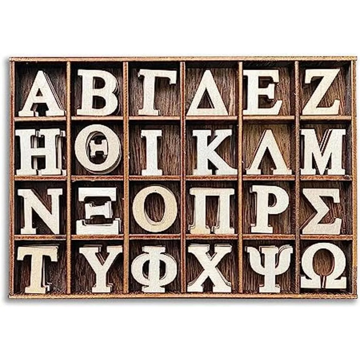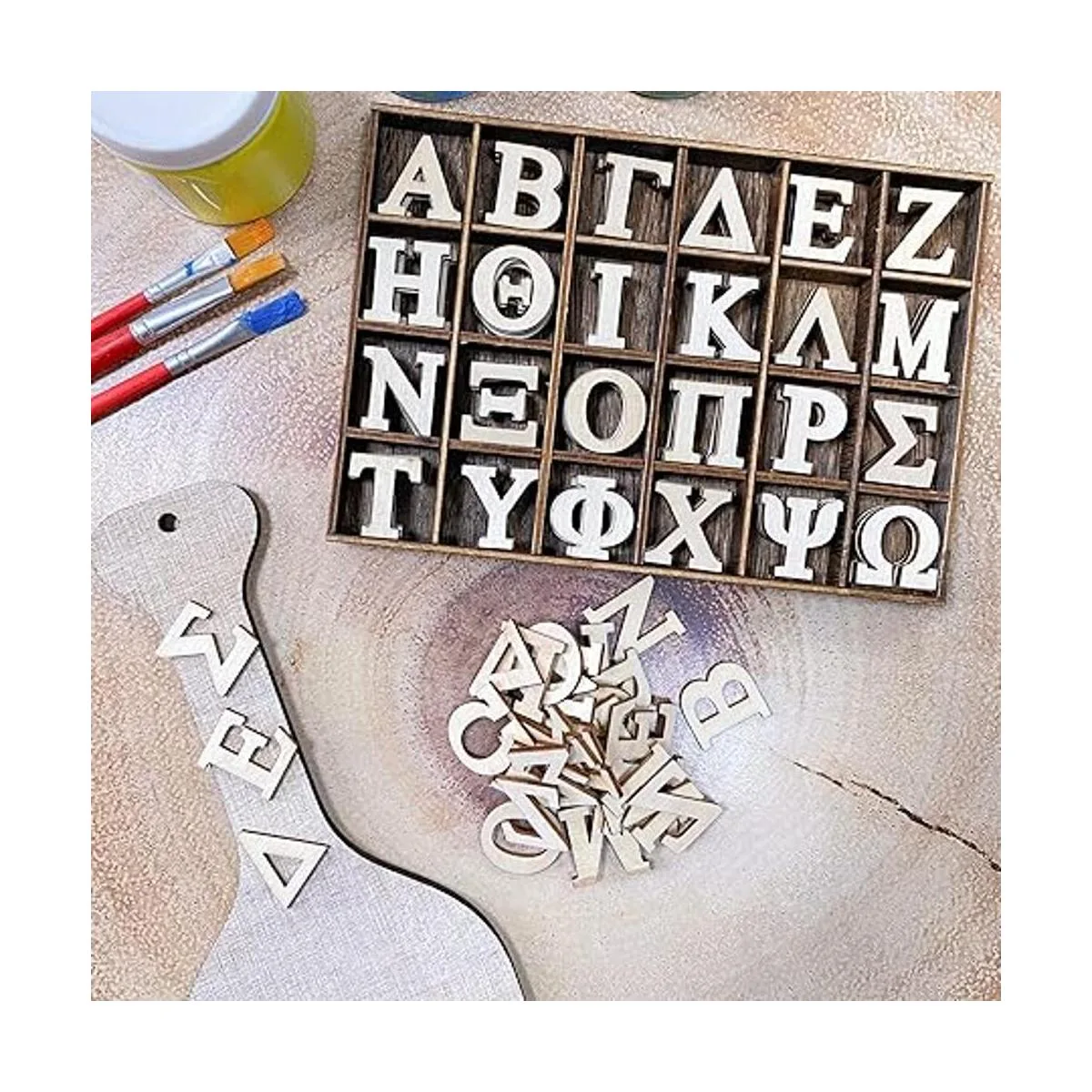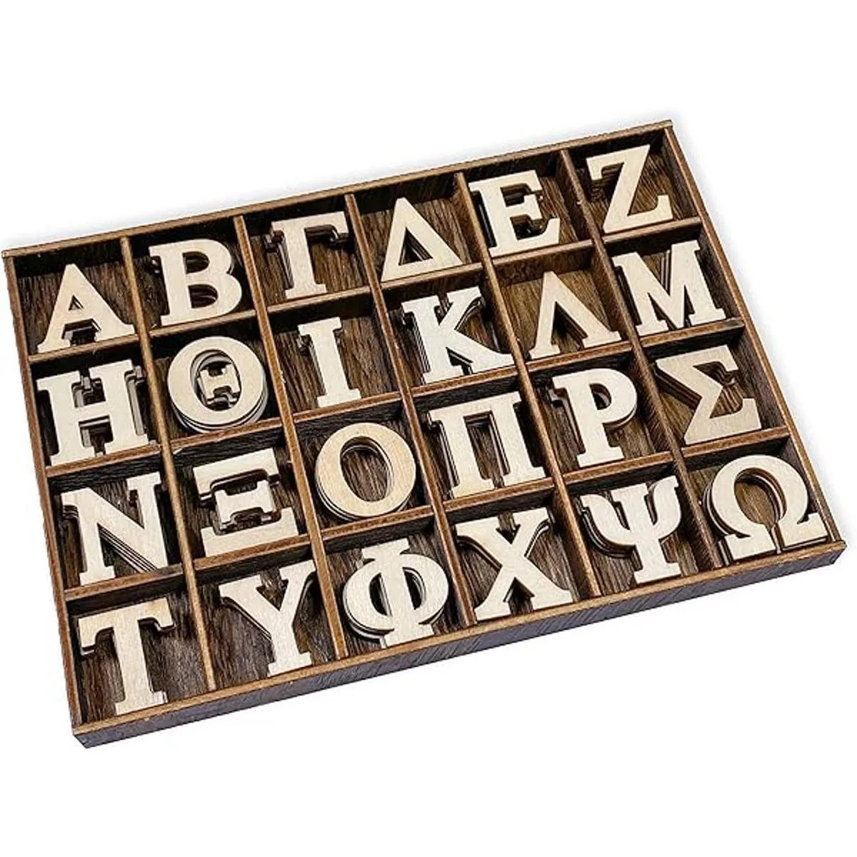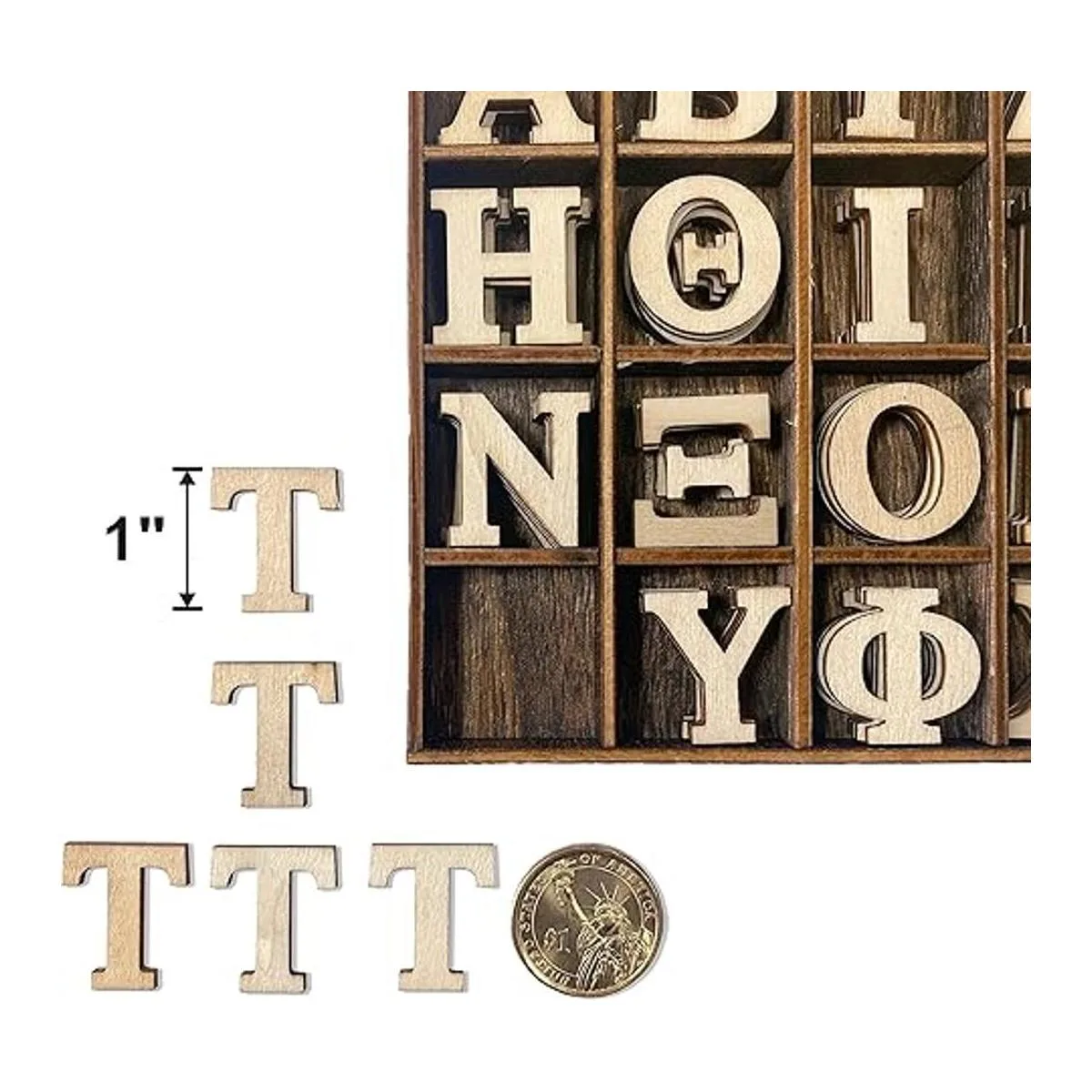 Incluye: total de 120 letras de madera sin terminar vienen con 5 juegos de alfabeto griego completo con una mini bandeja rústica fácil de acceder y almacenar diferentes letras para tu próximo proyecto de manualidades