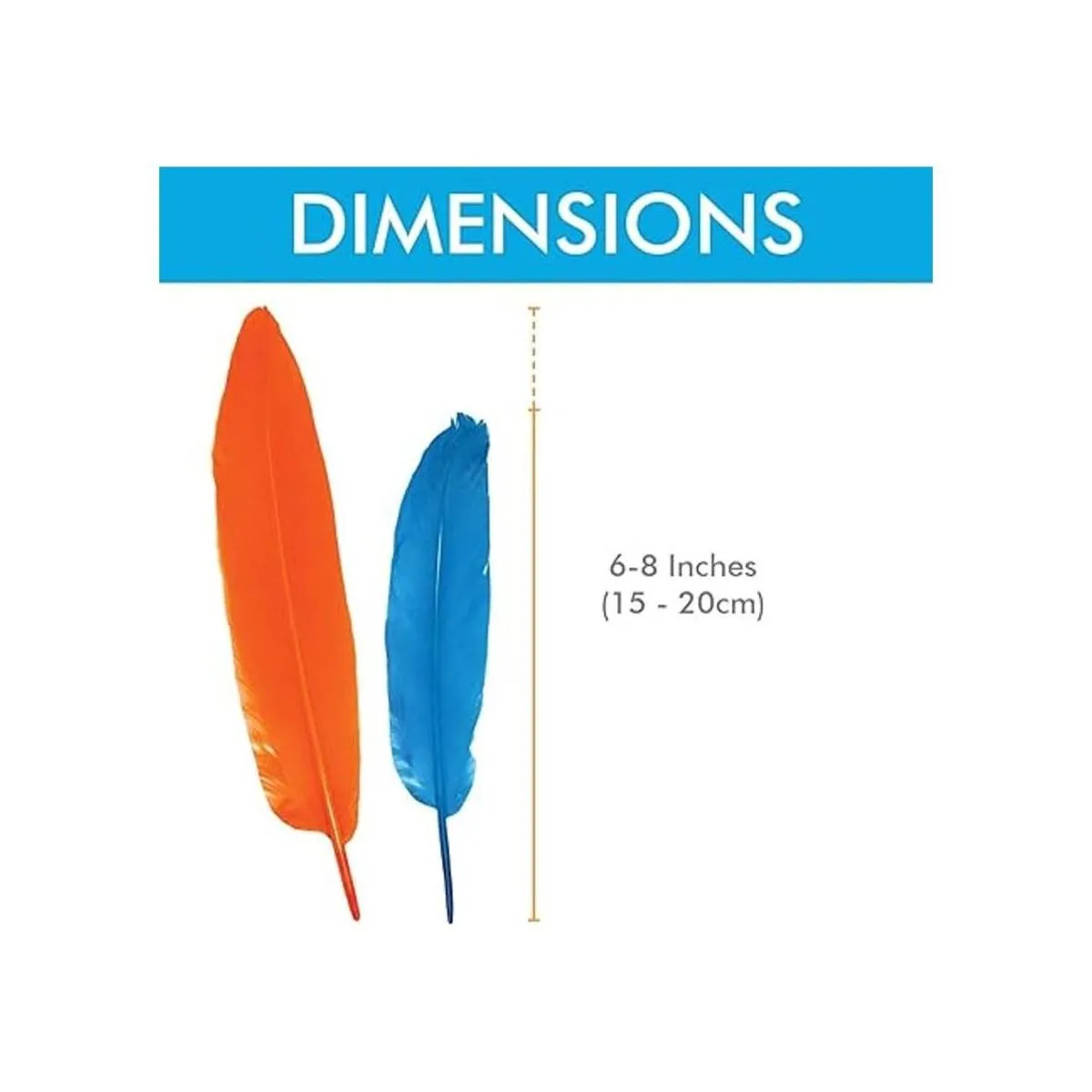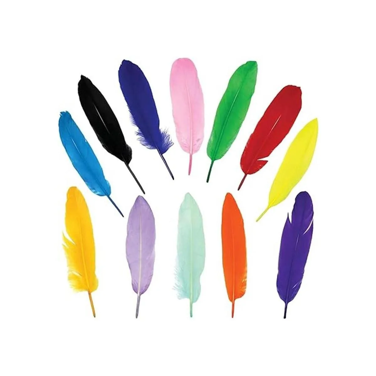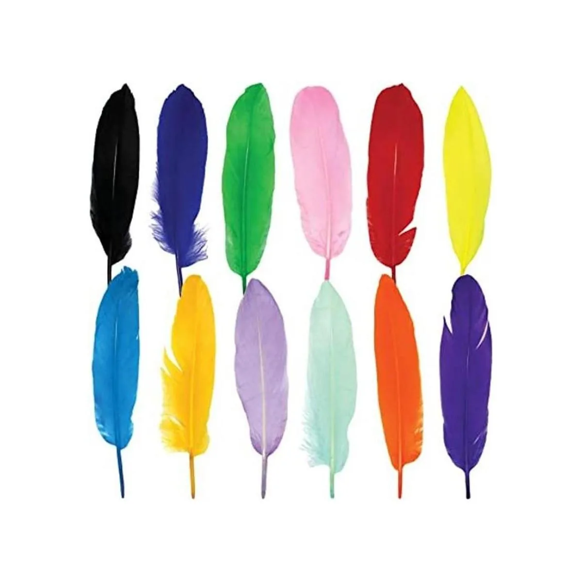 Auténticas plumas de ganso. Cada pluma mide 5.97.9 in. Viene en 12 colores: azul, cian, verde, menta, naranja, escarlata, rojo, rosa, lavanda, morado, amarillo y negro. Cada paquete viene con 10 piezas de cada color.