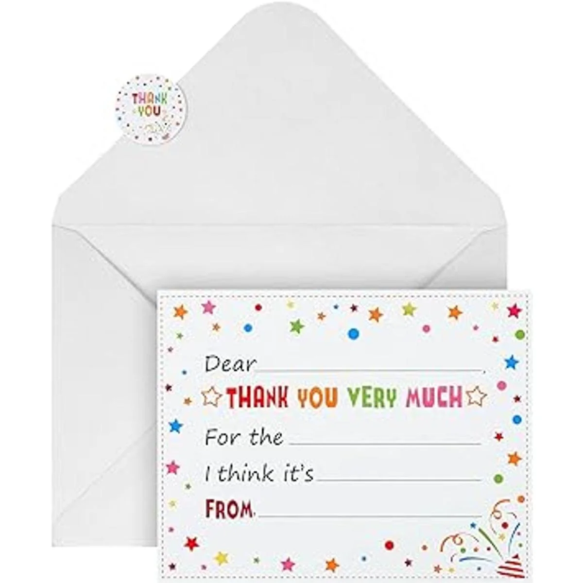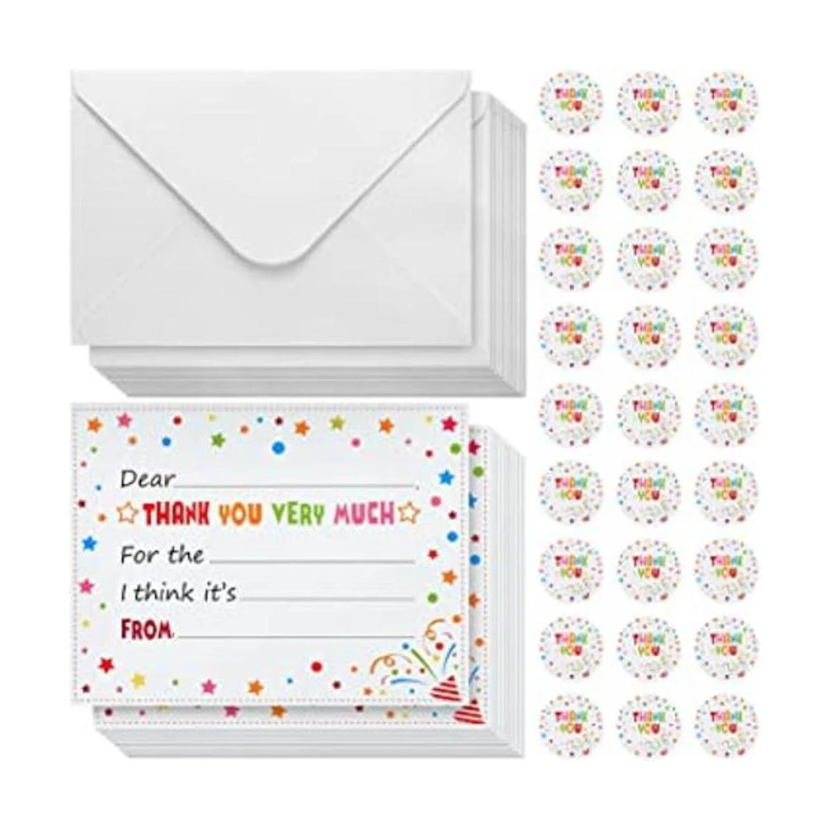 120 tarjetas de agradecimiento para niños, rellenan el espacio en blanco, incluyendo 40 tarjetas de agradecimiento coloridas con 40 sobres y 40 etiquetas de agradecimiento de confeti para niños y niñas, cumpleaños y graduación