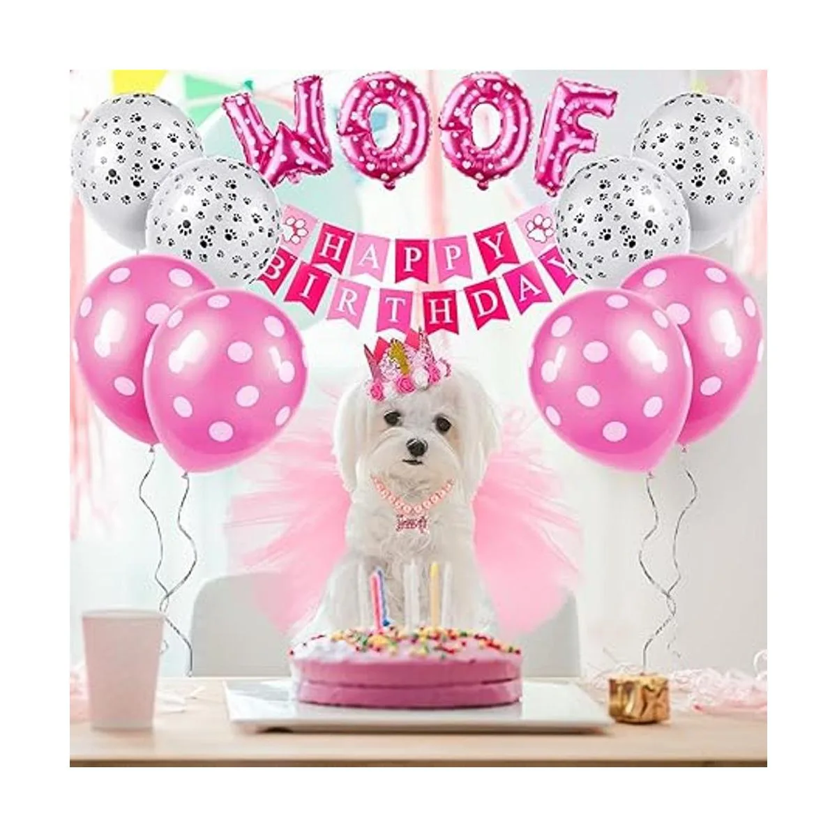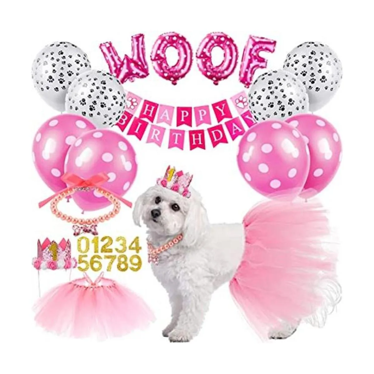 13 piezas de suministros para fiesta de cumpleaños para perros, decoraciones lindas para niñas, juego de pañuelos de cumpleaños con falda tutú rosa, sombrero de corona para perro, collar de perlas, pancarta de feliz cumpleaños, 9 globos de pata rosados, juguete para cachorros, mascotas, gatos, perros
