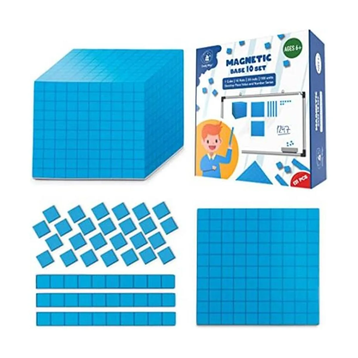 Regalo perfecto para apoyar el aprendizaje en casa o en una clase: los bloques Simply Magic Jumbo Base Ten son un gran regalo educativo para niños, padres, profesores y educadores. El juego de diez base magnética gigante incluye 1 cubo de tamaño grande, 10 planos cienos, 20 varillas decenas y 100 unidades unas. El juego de imanes Simply Magic incluye un juego completo para aprender, enseñar y divertirse