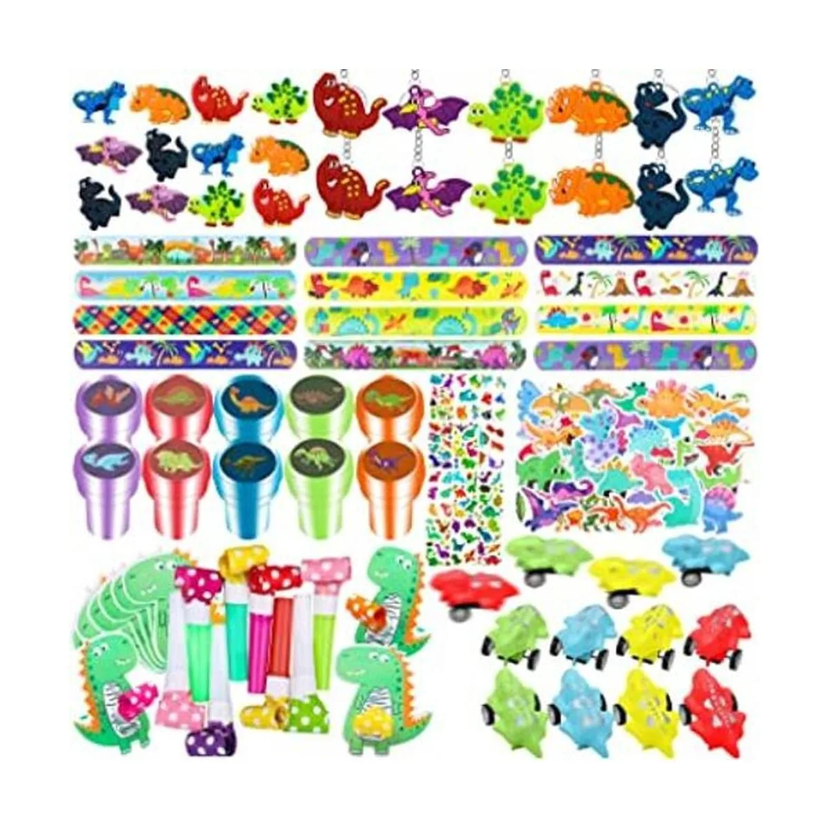 Rellenos de bolsas de regalo de dinosaurio: los 132 recuerdos de fiesta de dinosaurio tienen el tamaño y la calidad del traje, tipos de forma, anillos, pulsera de bofetada, máscaras de dinosaurio, patinetas de dedos atraerán a los niños más Puede ser adecuado para regalo para fiestas de cumpleaños, carnaval y premios para niños en la escuela. Será un éxito para los niños. Ahora tienes una fiesta de cumpleaños súper sorpresa para tus hijos
