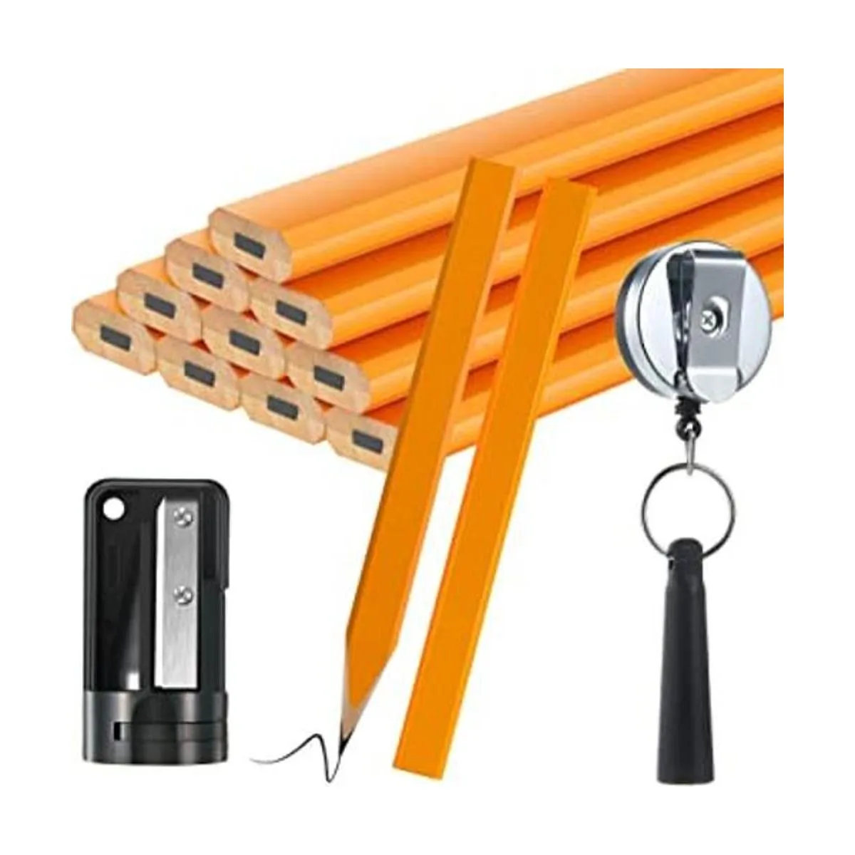 El paquete incluye: hay 12 lápices HB de carpintero plano de madera, 1 soporte retráctil y 1 sacapuntas manual en tu paquete, 14 piezas en total; el kit de carpintero proporciona completamente las herramientas de marcado que necesitas al hacer carpintería