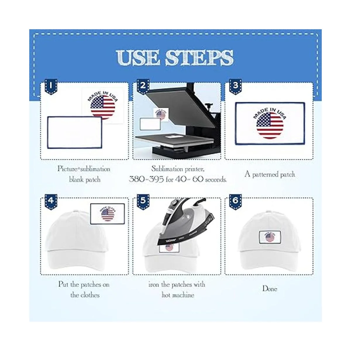 Instrucciones de sublimación continua: los parches en blanco para ropa se pueden fijar a sombreros o ropa, primero debes cubrir tus parches con papel, luego plancharlos a 300 grados con un calentador o plancha durante 3035 segundos, o coser los parches al sombrero o ropa con una aguja e hilo
