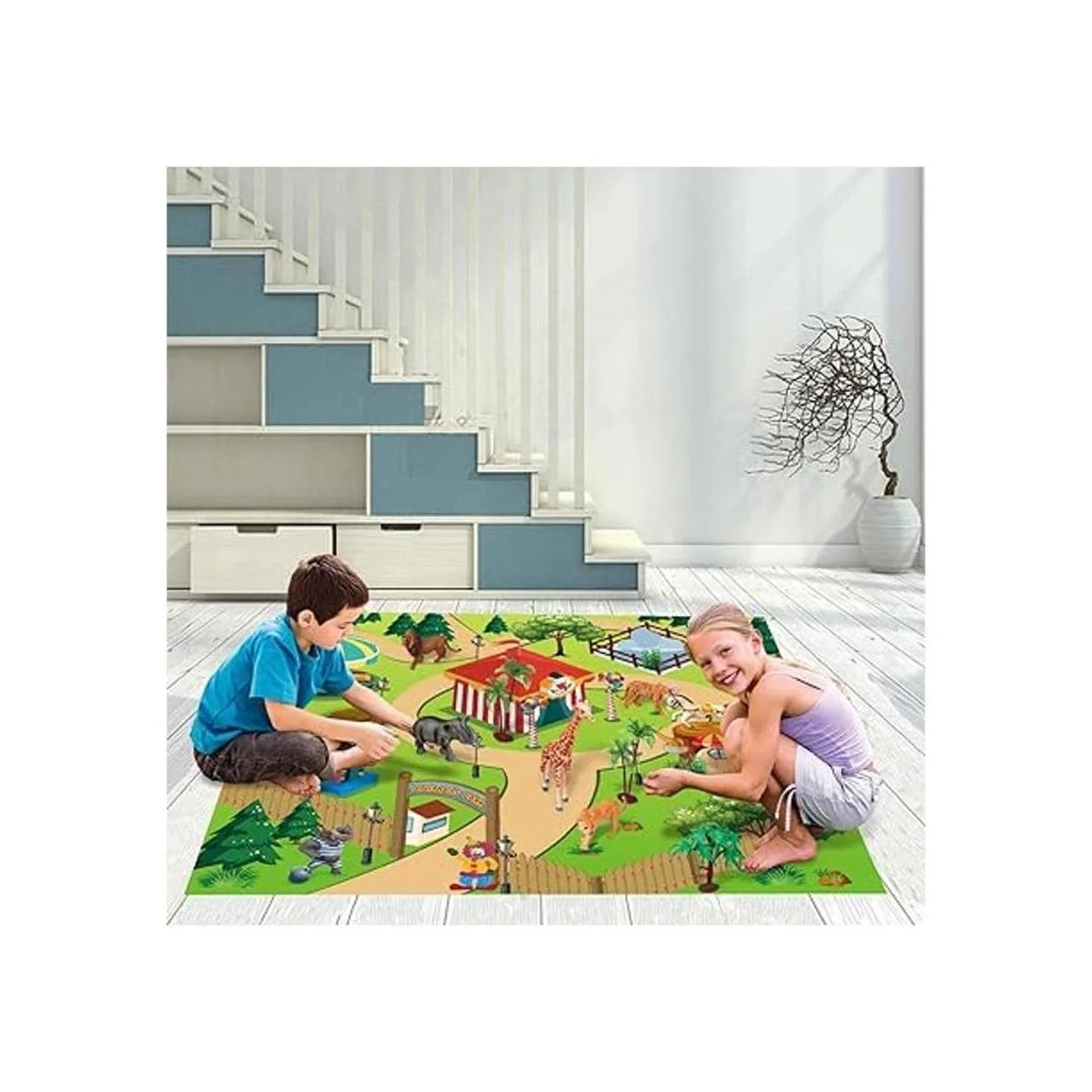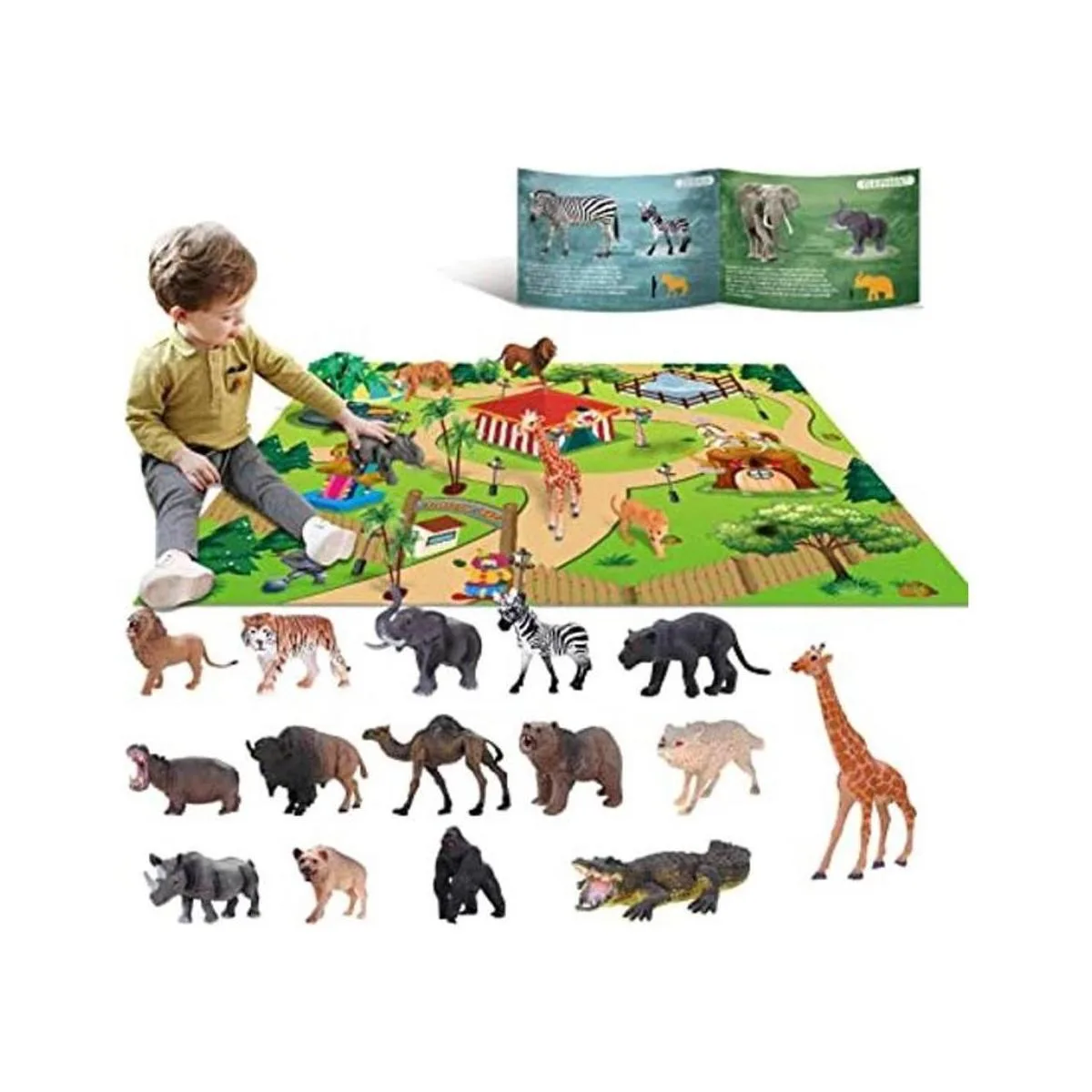 El paquete incluye: 15 animales, 3 árboles, 1 alfombrilla de juego del zoológico. 1 funda de almacenamiento. 1 caja de almacenamiento.
