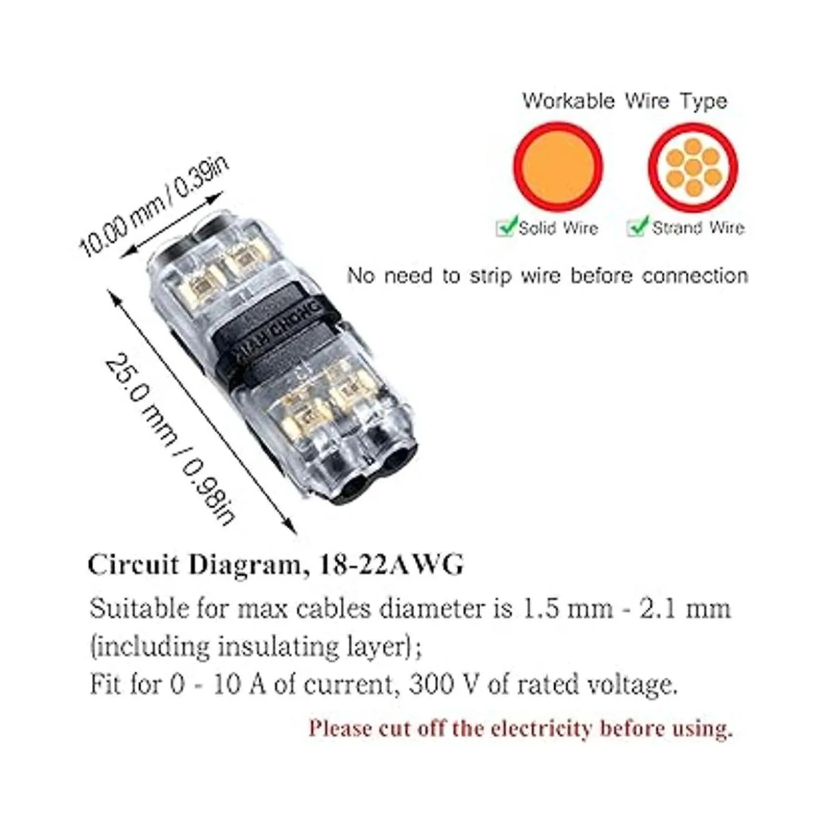 Conector de cable rápido: no requiere pelar cables, los conectores de empalme de cable son de diseño de conexión de cierre, sin tener que tirar, empujar y soldar; los conectores de cable son fáciles de usar de una manera efectiva; solo tienes que encajar las fuentes en estos conectores.