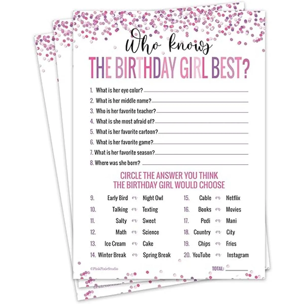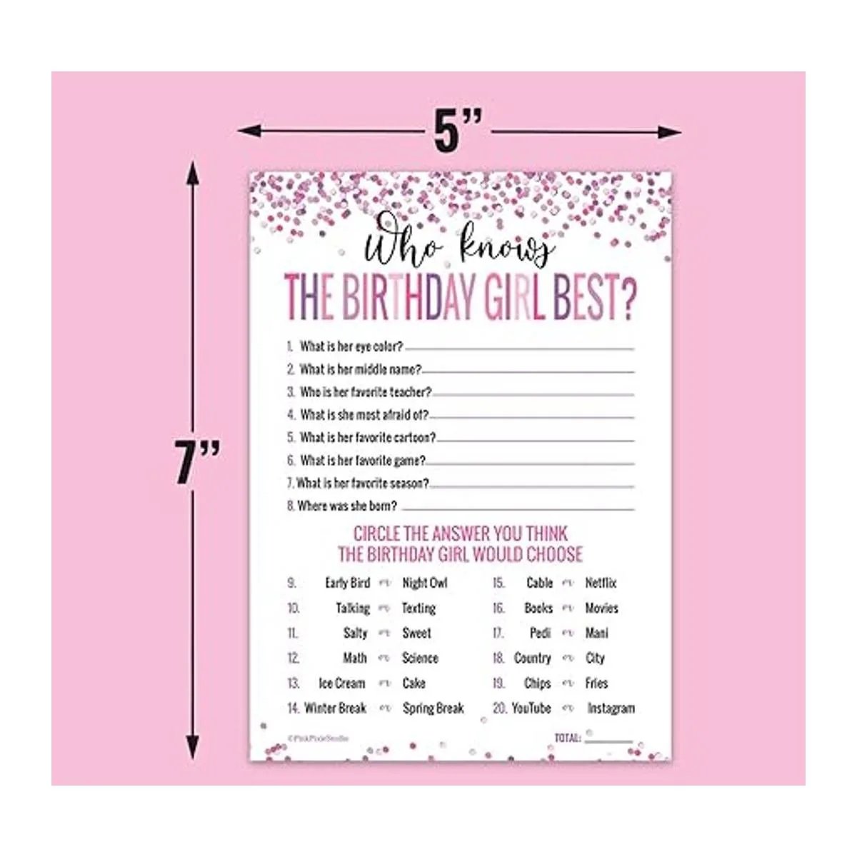 Juego divertido y fácil de fiesta: el kit incluye 15 tarjetas de juego. Haz que cada invitado adivine las respuestas que la chica de cumpleaños elegiría. Gran rompehielos de fiesta y aprenderás algunos hechos divertidos sobre la chica especial de cumpleaños.