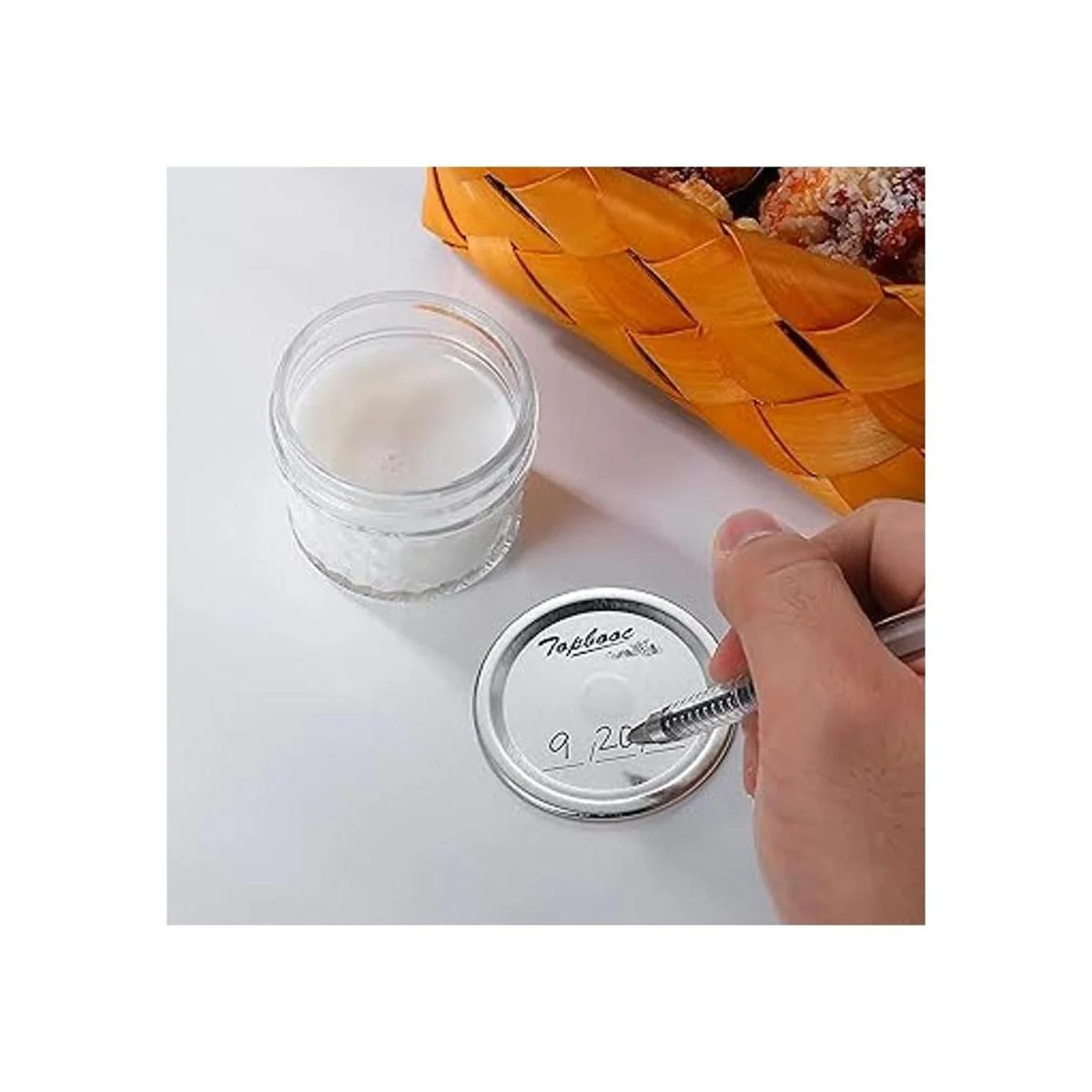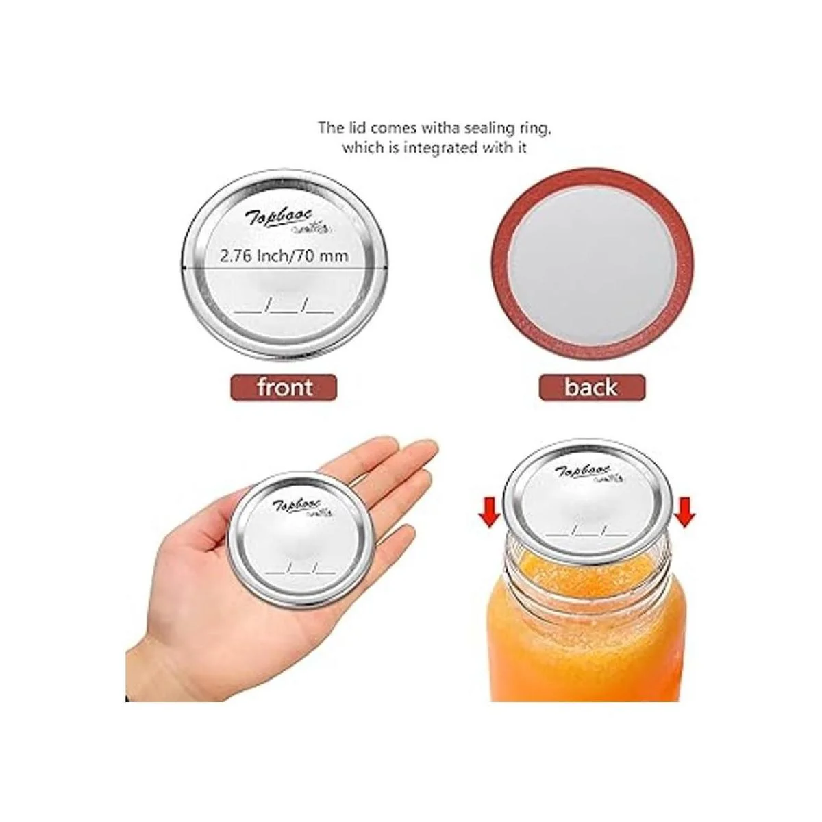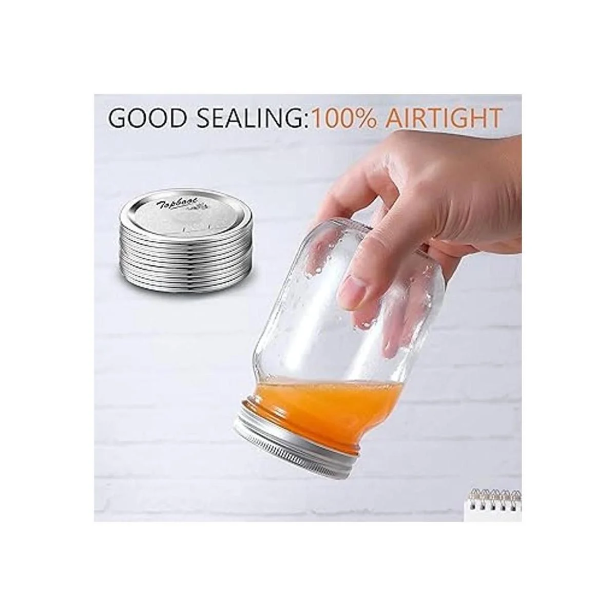 Excelente rendimiento de sellado: el anillo de sellado dentro de la tapa del tarro hace que las tapas del tarro de conservas Mason tengan un buen rendimiento de sellado, hermético y sin fugas, el sellado hermético garantiza que sea adecuado para mantener alimentos, granos, aderezos, bebidas frescas, no hay necesidad de preocuparse por fugas que puedan contaminar la cocina u otros lugares después de sellar materiales