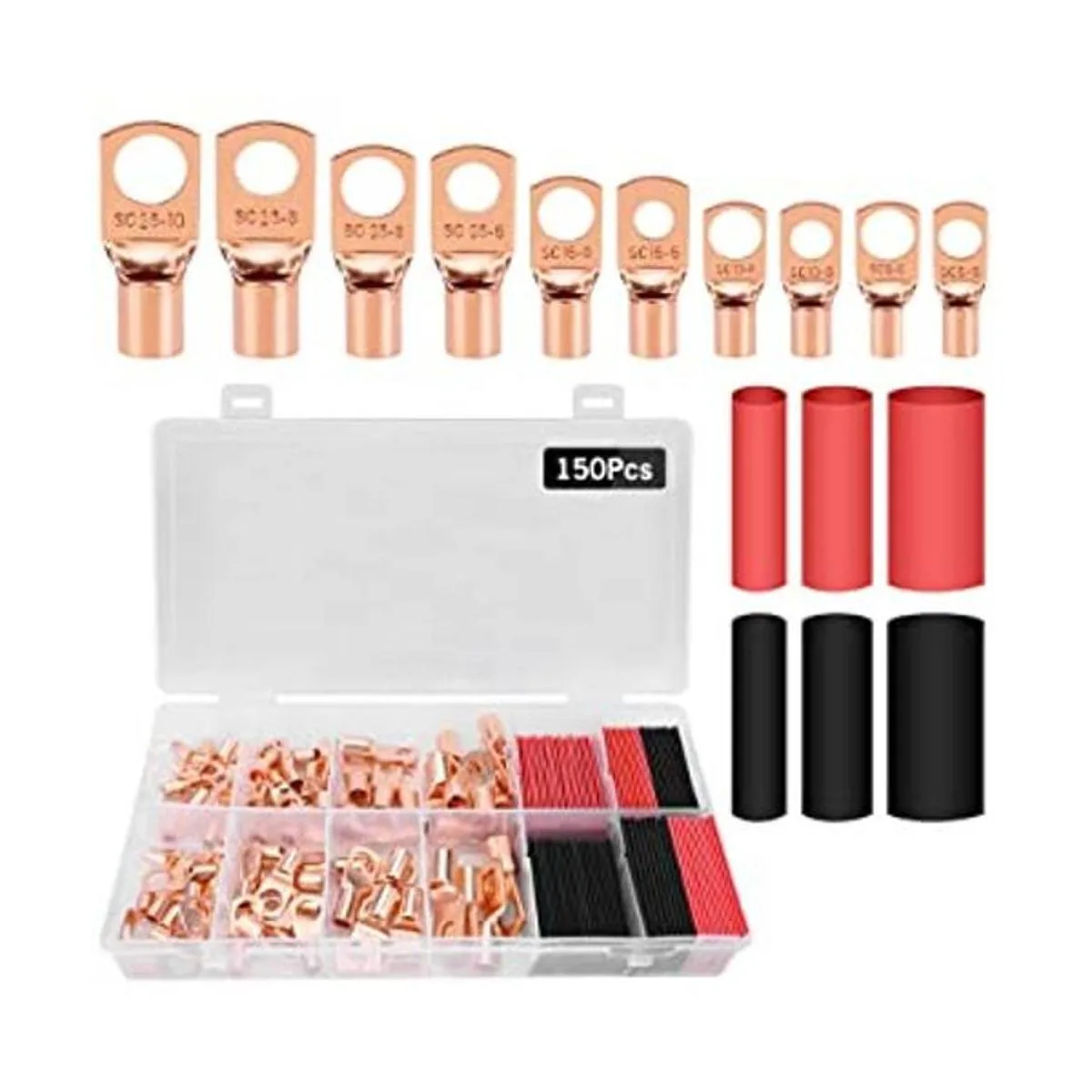 150 terminales de alambre de cobre, 70 conectores de terminales de alambre de cobre AWG 2, 4, 6, 8, 10, 12 conectores de terminales de alambre de cobre con 80 tubos termoretráctiles, cable de batería resistente, conectores de terminales de anillo tubular de extremo cerrado