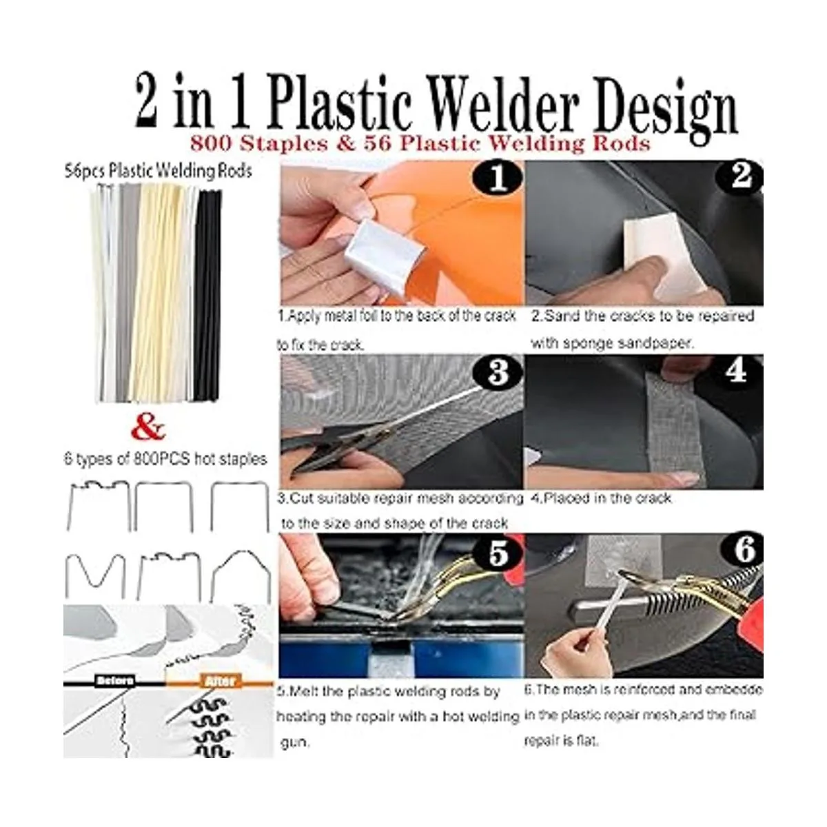 New Updated Accessories : Equipped with 800 hot staples and 56 7 kinds of Plastic Welding Rods to meet your different welding needs. Plastic Welding Rods are suitable for different surfaces. Cracked and damaged plastic parts can be welded quickly and easily, putting them back together nicely,saves time and effort, and improves the work efficiency.