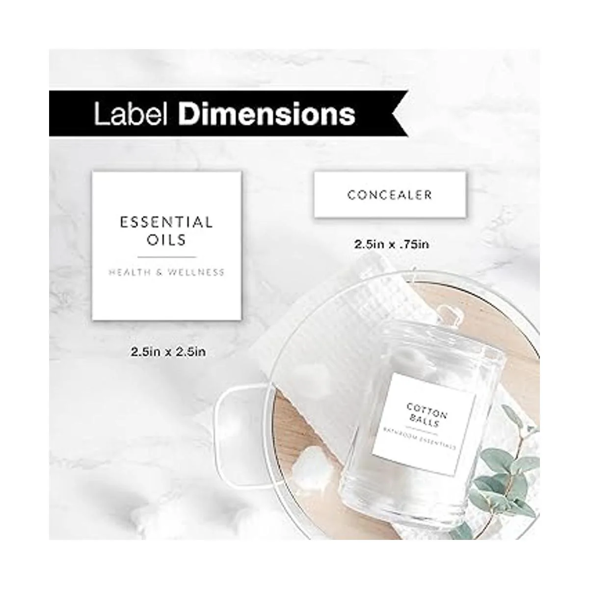 Sin escritura a mano desordenada: las etiquetas minimalistas son cuadradas 2.5 x 2.5 pulgadas con texto negro sobre etiquetas impermeables blancas. Las subcategorías de etiquetas organizadoras de maquillaje son etiquetas rectangulares más pequeñas.