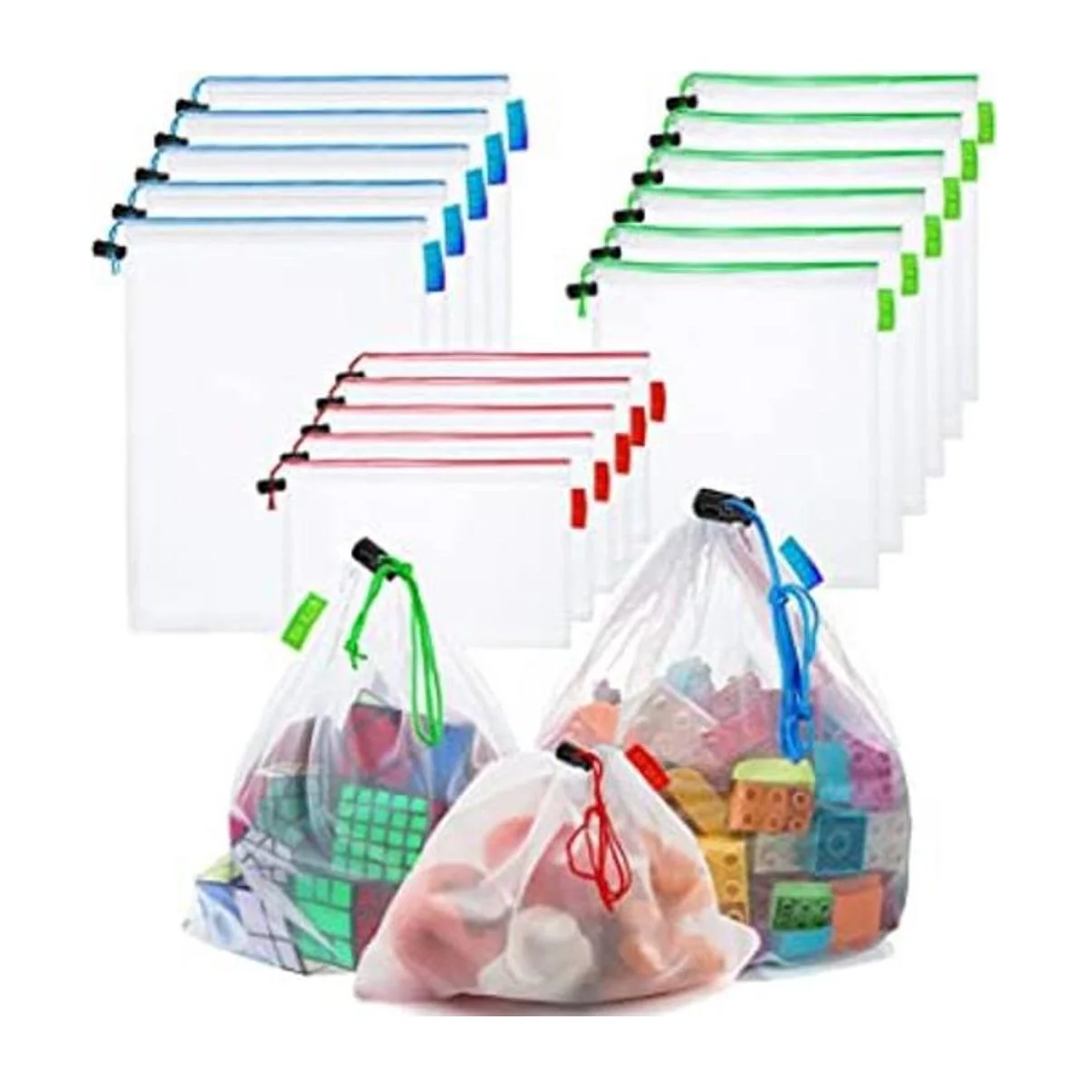 16 bolsas pequeñas de malla para almacenamiento, 3 tamaños reutilizables de malla con cordón, bolsa de rompecabezas para almacenamiento de niños, organización de sala de juegos, frutas, verduras