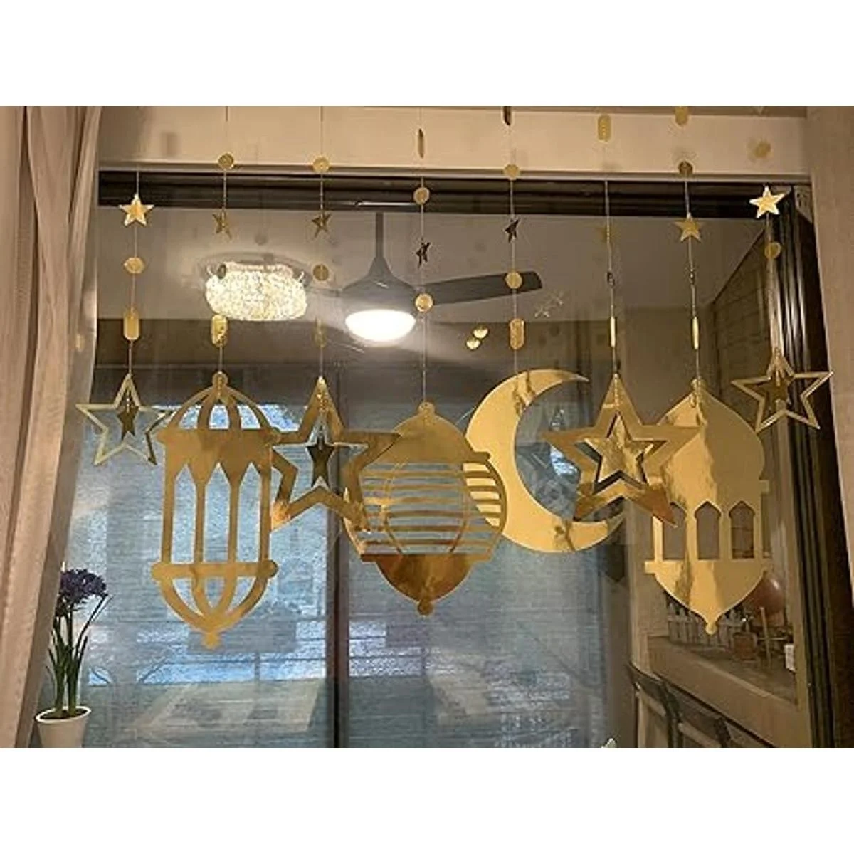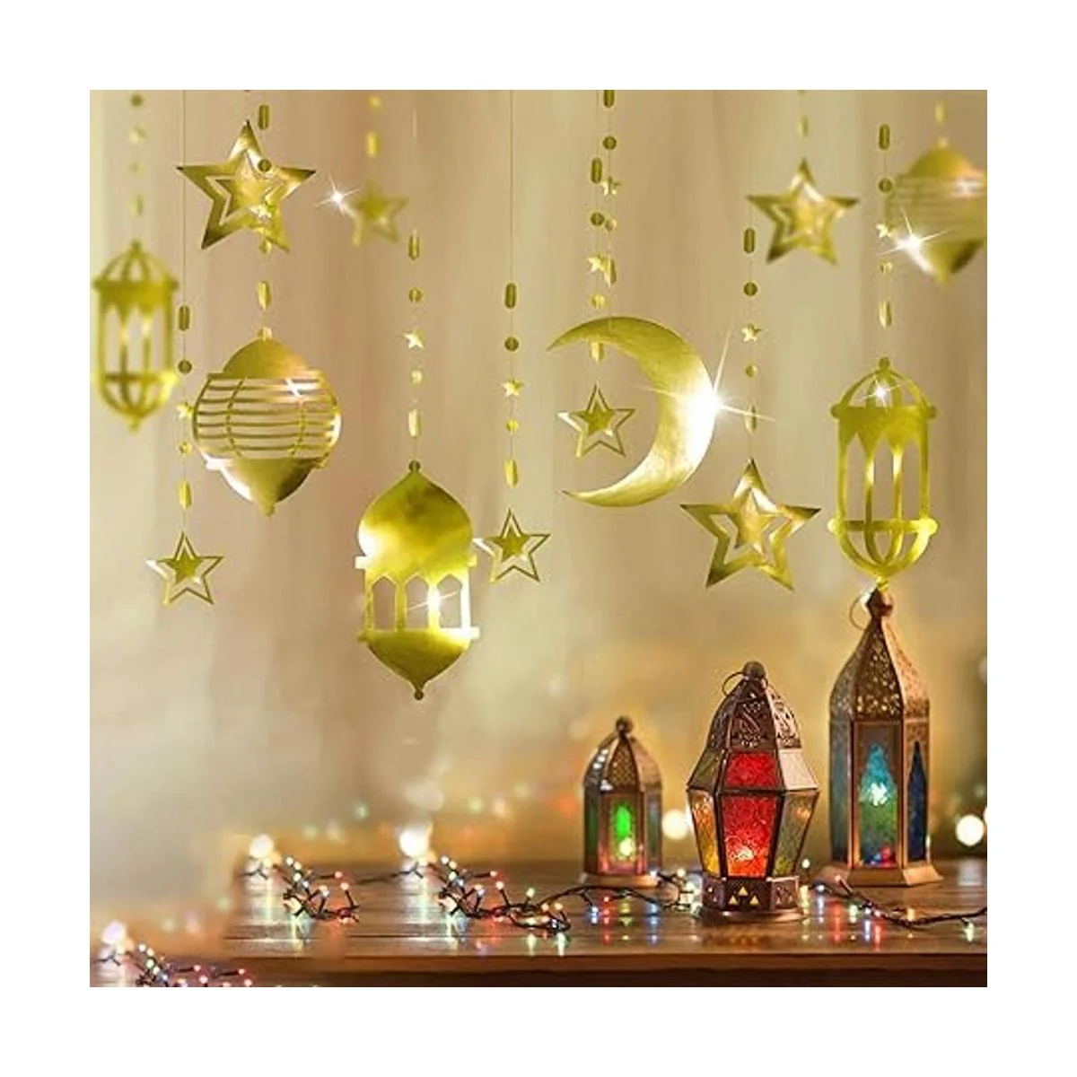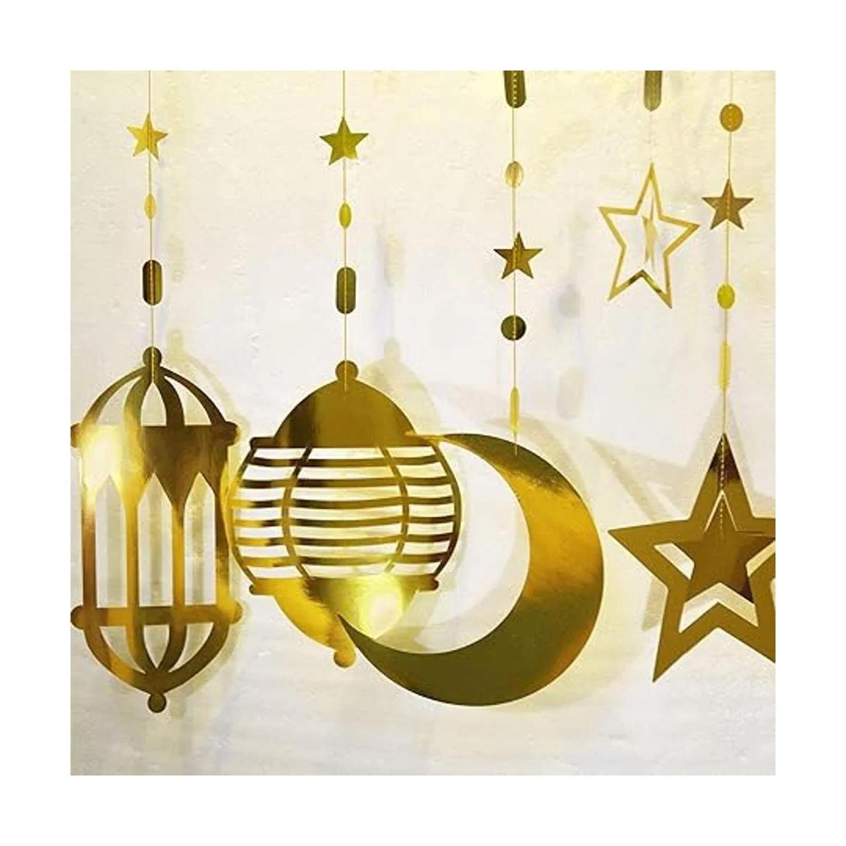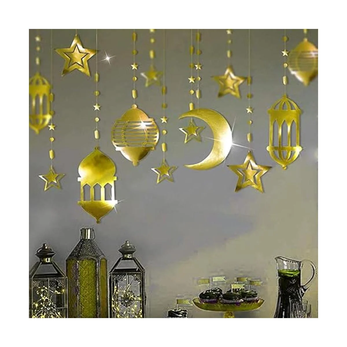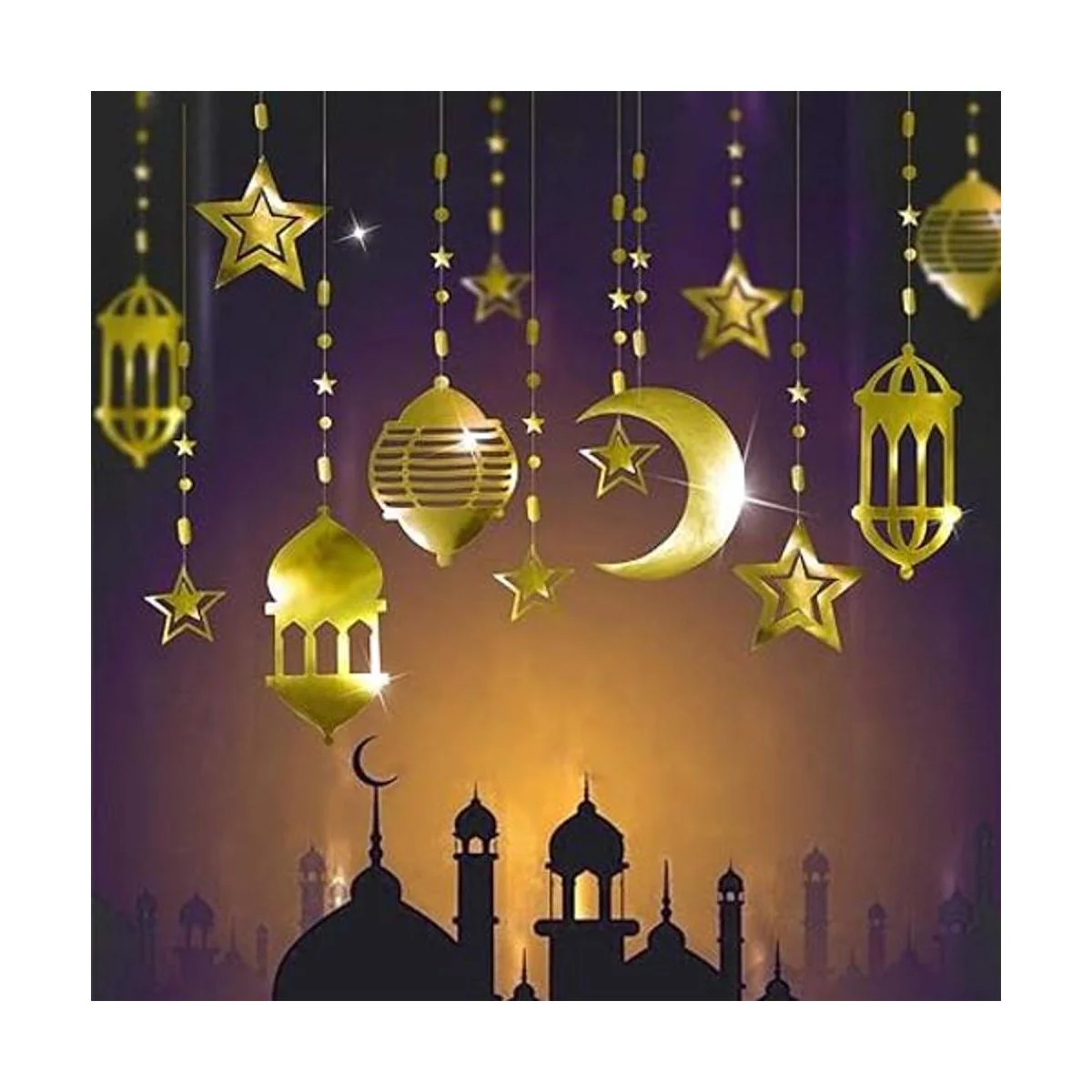 El paquete incluye : 2 paquetes de 8 piezas. de serpentinas de espejo brillantes doradas de varios carteles de luna creciente, estrella y linterna, cada uno suspendido de una hebra de pequeños círculos, ovalados y estrellas. 16 unidades. Con tamaños de pancarta varían de 4.4 a 12 pulgadas de altura.