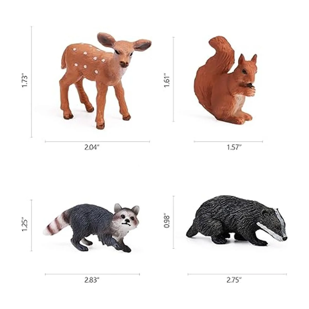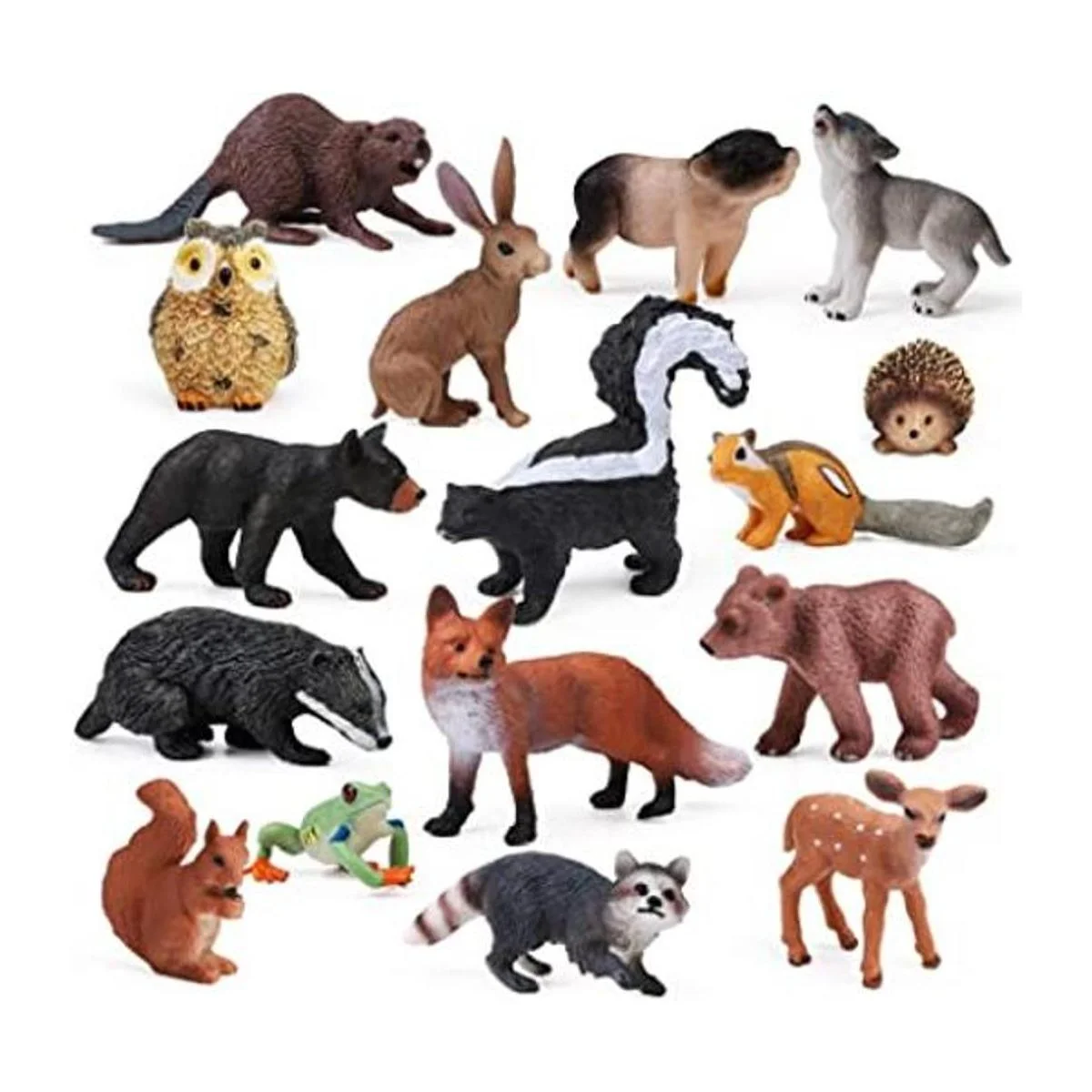 16 figuras de juguete del bosque: cachorro de oso, mapache, cerdito recién nacido, conejo, zorro rojo, tejón, cachorro de oso negro, ardilla, ardilla, mofeta, bebé lobo gris, rana de árbol, bebé erizo, cervatillo, castor y búho.
