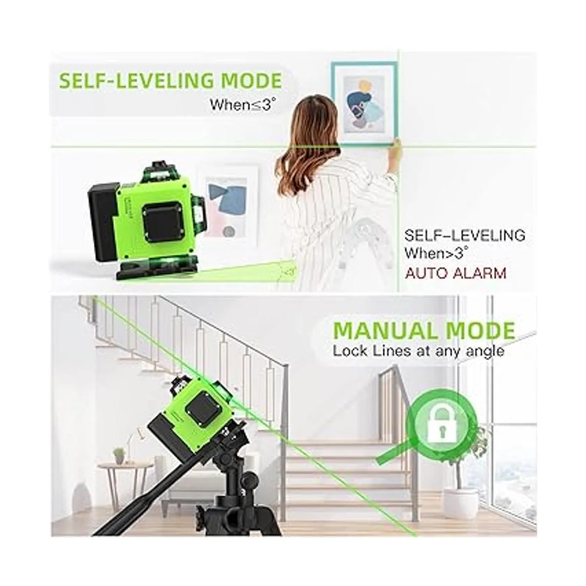 Autonivelación y modo manual: si el ángulo de inclinación es 3, el nivel láser se nivela automáticamente, de lo contrario emitirá un pitido continuo con alarma de sonido. Una vez bloqueado el péndulo, cambia al modo manual para bloquear las líneas para su uso en cualquier ángulo.