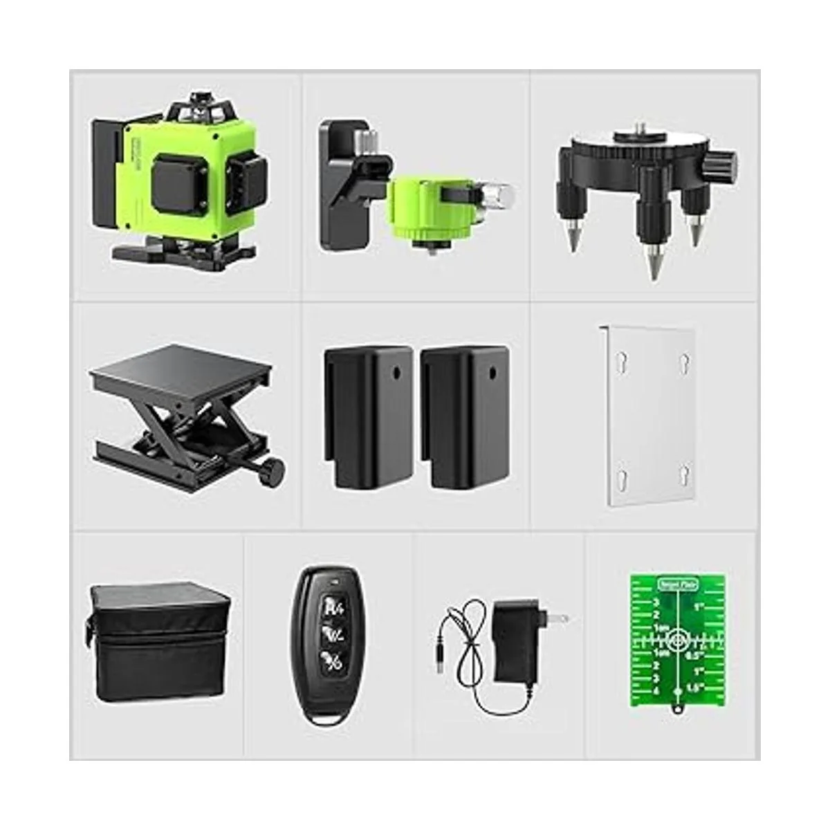 Lo que obtienes: 1 nivel láser 4D de 16 líneas, 1 bolsa de transporte, 1 cargador de alimentación, 1 soporte de banda de rodadura de 1/4 pulgadas, 1 soporte de banda de rodadura de 5/8 a 20 pulgadas, 1 hierro de pared, 1 manual de usuario idioma español no garantizado, 1 control remoto, 1 placa de objetivo verde, 1 soporte de pared, 1 plataforma de elevación, 2 baterías de 40000000 mAh.