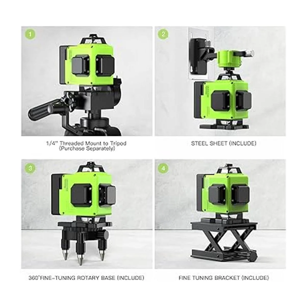Haz verde de mayor visibilidad y alta precisión: nuestro nivel láser verde ofrece la última tecnología de diodos, que es 4 veces más brillante que el haz láser rojo tradicional y mayor precisión. El nivel láser 4D proporciona una cobertura de nivelación completa con una precisión de 1/10 pulgadas a 8 pies y un rango máximo de trabajo de 70 pies. El brillo se puede ajustar del 1 al 100. Nivel de seguridad: clase II, salida de potencia 1 mW. Adecuado para interiores y exteriores.
