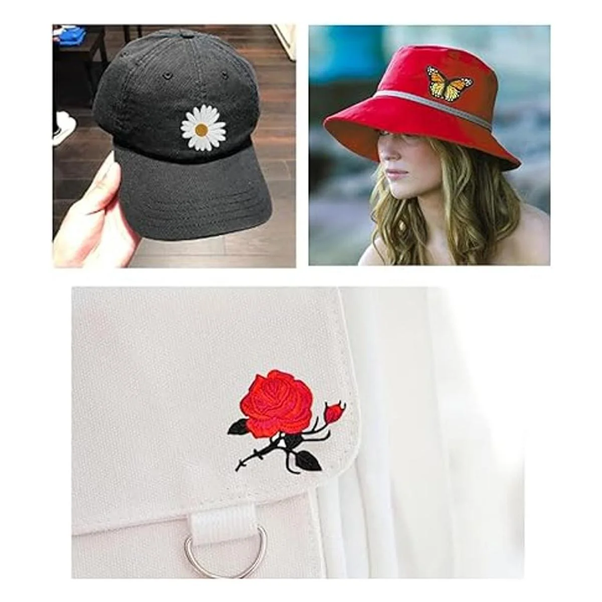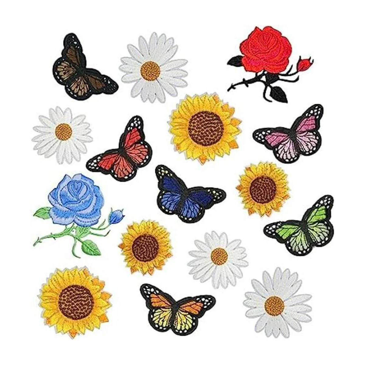 Incluye 6 hermosos parches bordados de mariposa de diferentes colores, 2 parches de rosa, 4 parches de margaritas y 4 parches de girasoles.