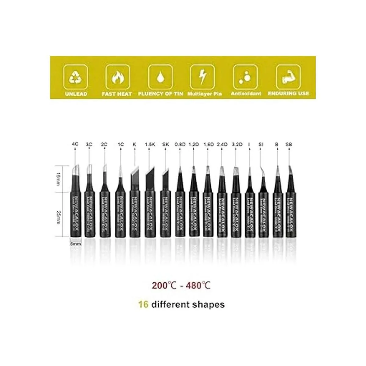 16 puntas de hierro de diferentes formas para tu mayor demanda de soldadura sobre los diferentes componentes de las placas PCB. Adecuado para galvanoplastia, anticorrosión, antioxidación, larga vida útil. Viene con una caja de plástico conveniente para recoger las puntas después de soldar.
