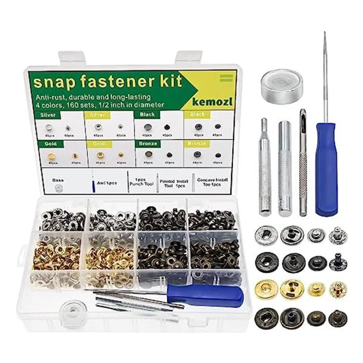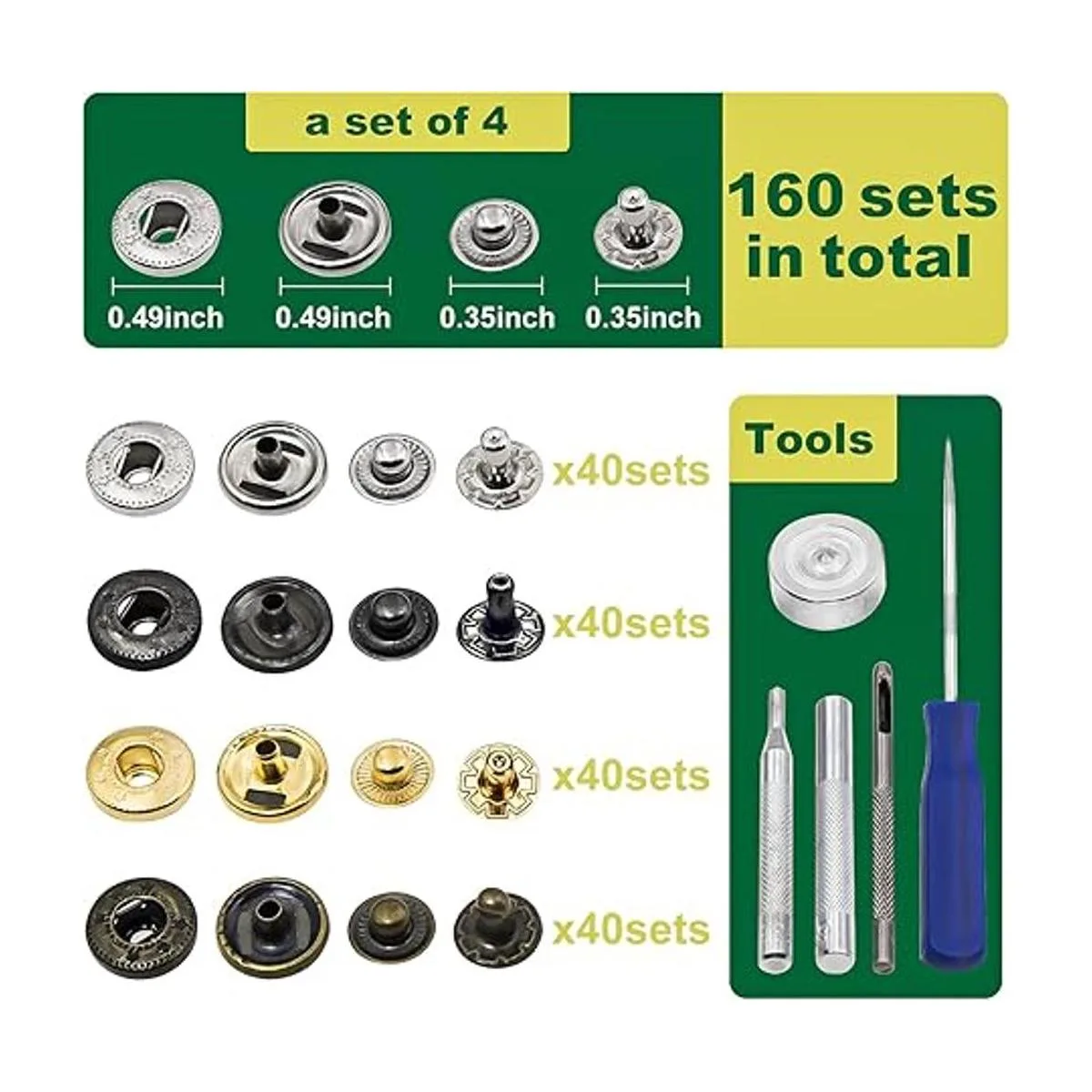 160 juegos de botones a presión, kit de cierre a presión, kit de reparación de botones de metal, broches resistentes para costura, ropa, chaqueta, pantalones de mezclilla con 0.492 in