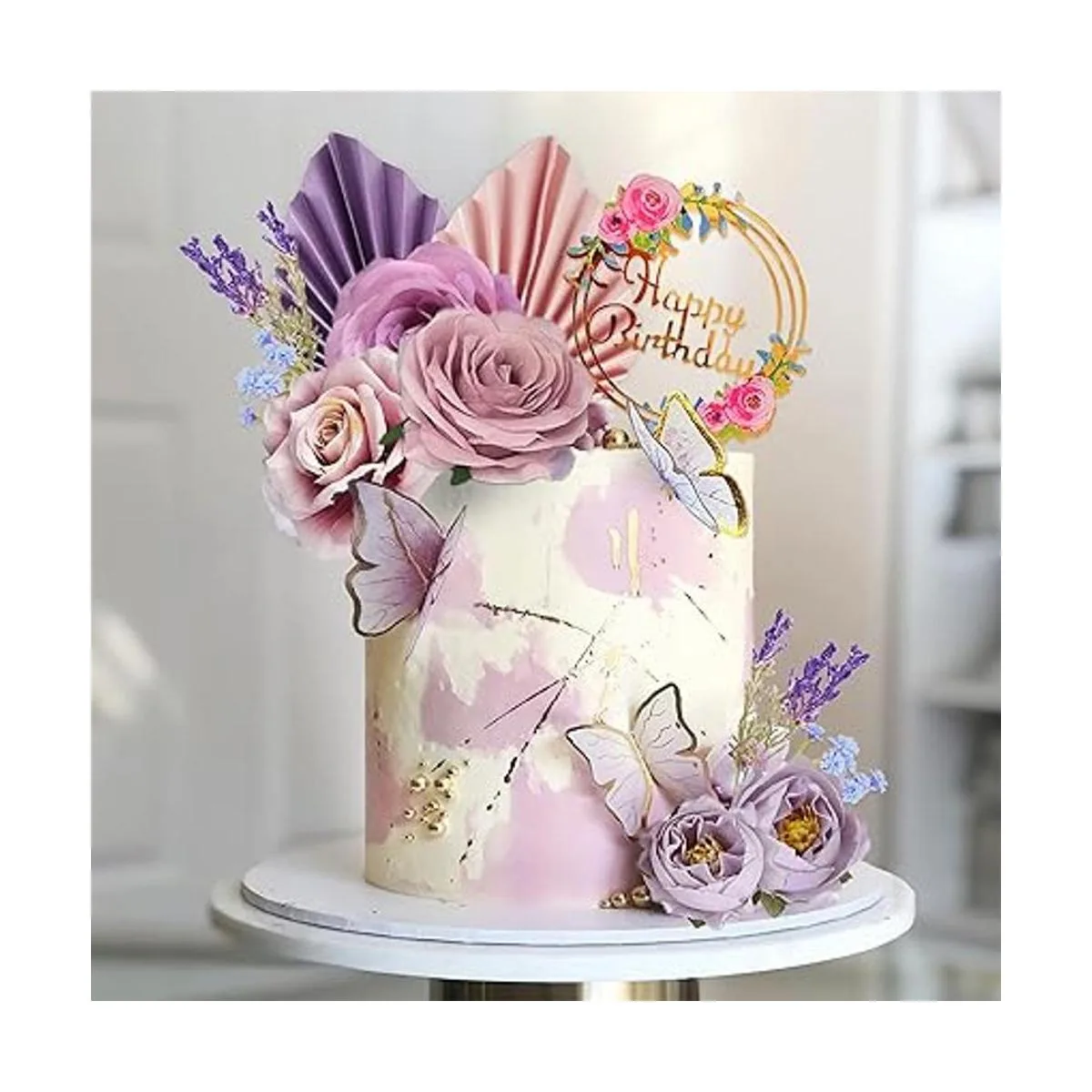 Material seguro: estas decoraciones para tartas de flores están hechas de plantas artificiales y flores de seda, mariposas vívidas y decoración bohemia para tartas están hechas de papel de alta calidad, con decoración acrílica de feliz cumpleaños para crear un estilo natural fuerte, duradero, seguro y no tóxico, y se puede reciclar después del lavado.