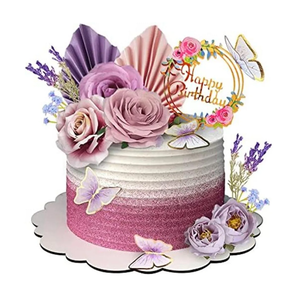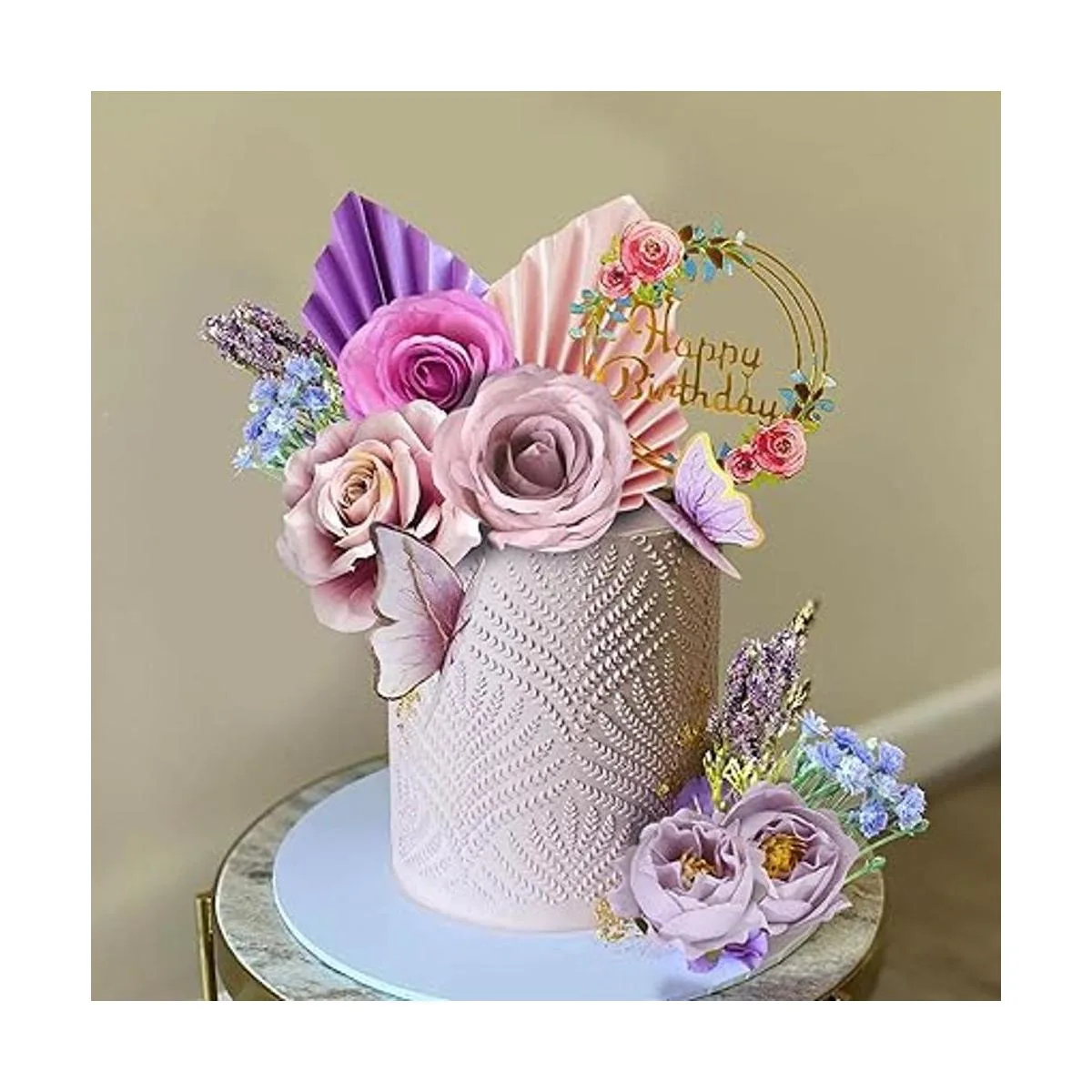 17 piezas de adornos de pastel de flores, decoraciones de pastel de mariposa, adornos de pastel de feliz cumpleaños con eucalipto artificial morado y rosa para fiesta de cumpleaños, boda, baby shower morado