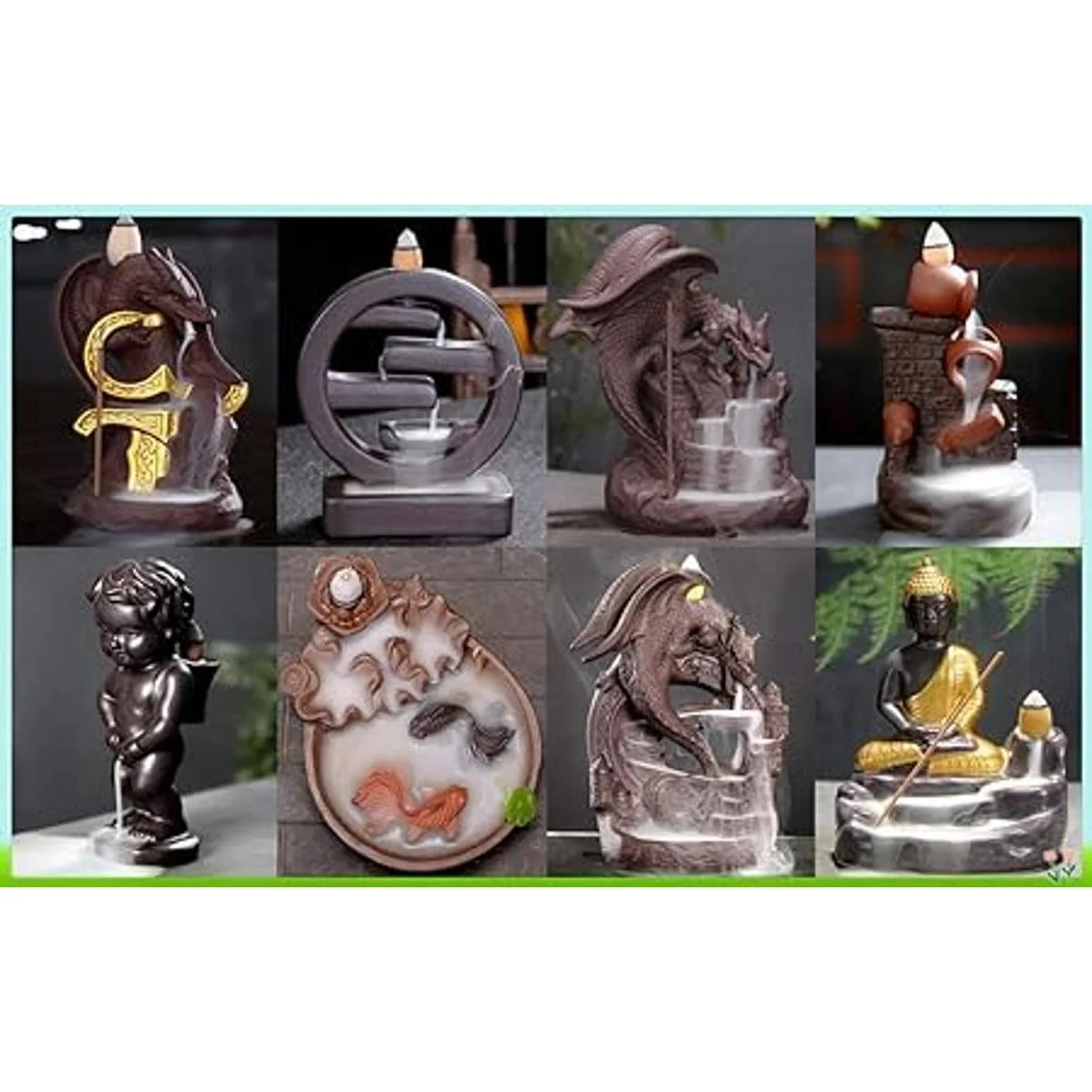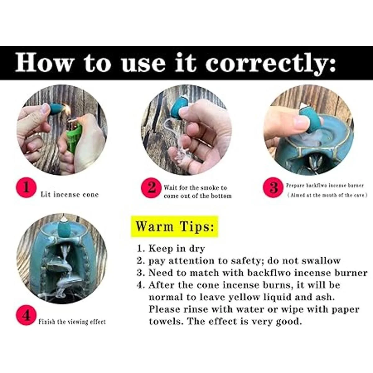 Retroflujo: cono de incienso de reflujo, cono de incienso de combustión colocado en el agujero de los soportes de incienso, cuando se quema, el humo cae como una cascada, y el cono emite humo grueso que parece agua, creando un efecto de fuente fascinante y relajante. Así que asegúrate de pedir tu soporte de incienso antes de obtener los conos, por lo que se utilizarán a todo su potencial.