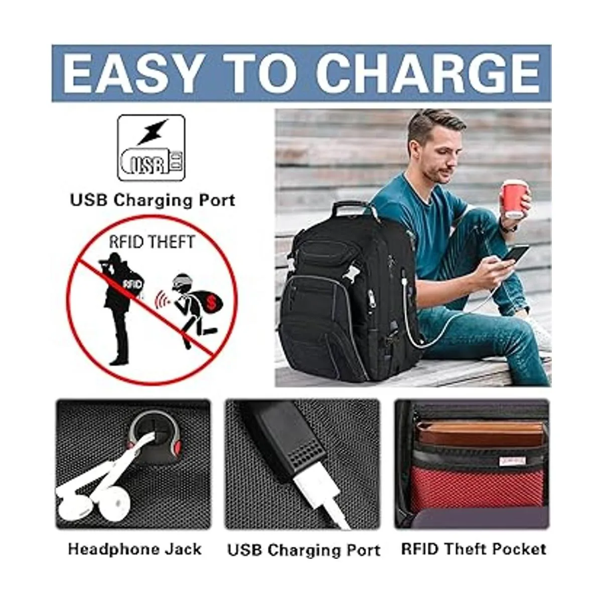 USB Charging Water Resistant:External USB port with setin charging cable offers convenient charging your cellphone and other electronic devices everywhere. A hole for headphone outside gives easy access to Earphone usage. The travel backpack made of waterresistant sturdy polyester fabriclong time soaking is not recommended, with heavyduty locked zippers, which can withstand harsh conditions and heavy use. A rugged handle with steel cable on the top is easy for you to carry with one hand.