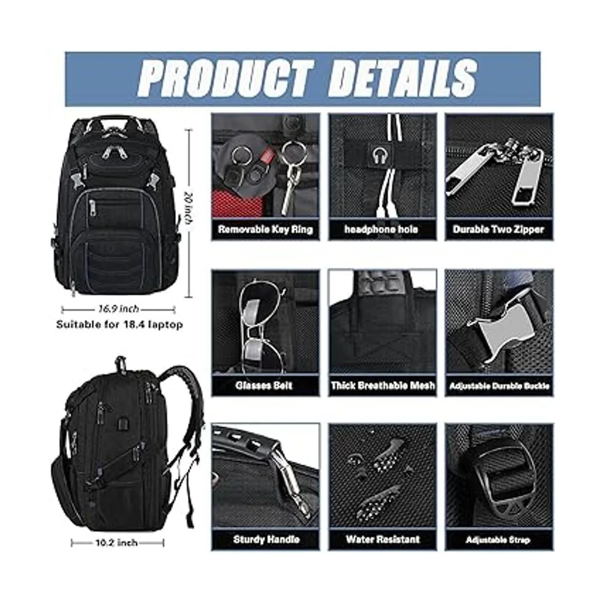 RFID Backpack AntiTheft:The front pocket of 18.4 inch Laptop backpack for men with advanced RFID security technology, unique metal composites identification helps secure personal data encoded on you credit cards, IDs and passports.The oversized antitheft pocket on the back of the backpack makes it easy to put your phone, passports and wallet.
