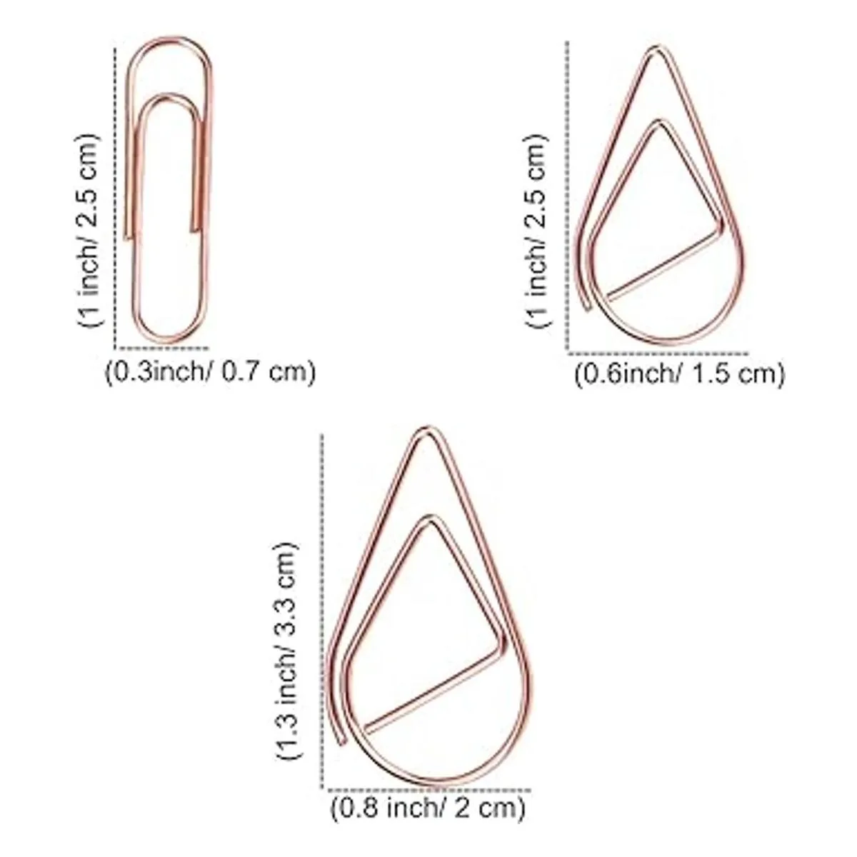 Lo que se obtiene: 100 pequeños clips de papel en forma gota de agua y 50 Grandes oro rosa S25 x 15 mm. L50 X 30 mm., 150 oro rosa clips de papel estándar 28 x 8 mm. en una caja resistente.