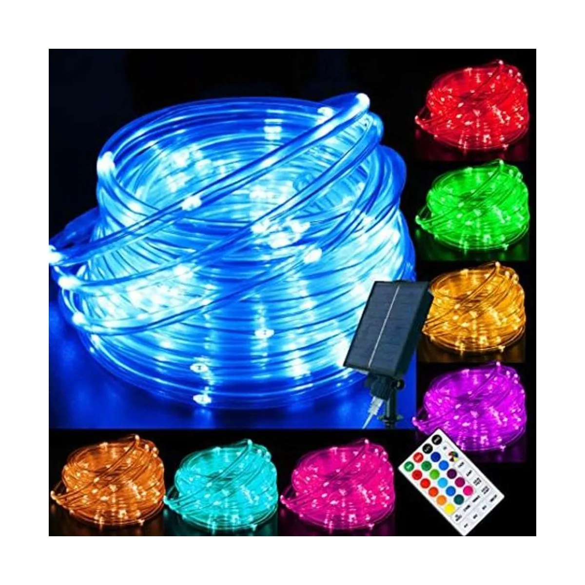 18 colores de 33 pies de cuerda solar LED impermeable para exteriores, 100 luces LED que cambian de color, azul, verde, rosa, cadena de luces tubo, temporizador remoto para jardín, valla, árbol, fiesta, Navidad, decoración navideña