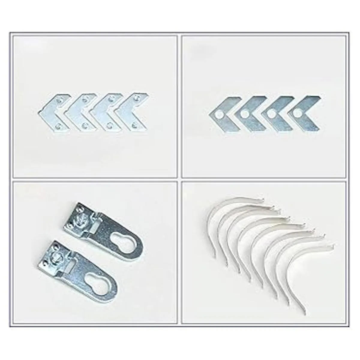 Color: plateado. Material: metal. Tamaño: como se muestra en la foto. El paquete incluye: 1 juego 18 piezas de cada pedido, 4 esquinas, 4 juntas, 8 clips de resorte y 2 ganchos para colgar.
