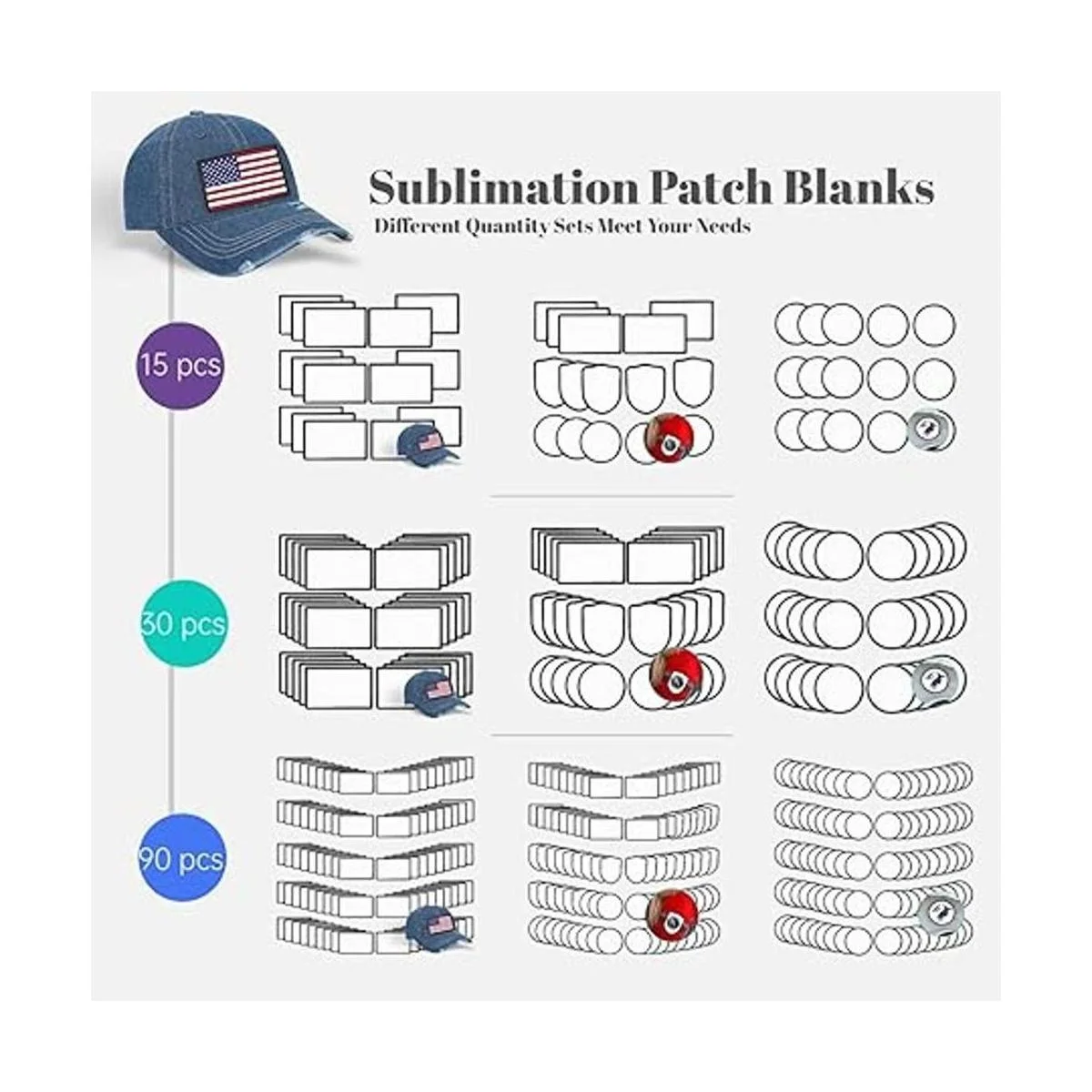 15 pieces sublimation blank patches in rectangle shape, each is approx. 3 x 2 inches, which is the most commonly used size. You can DIY for your family or share them with your friends to enjoy DIY fun