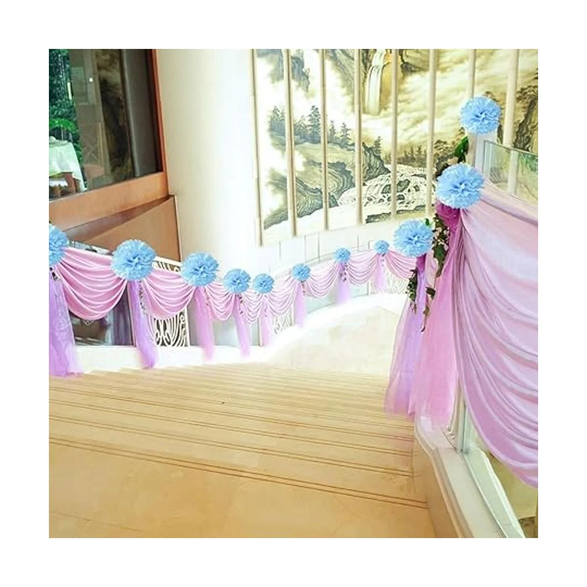 Fácil de montar: el pompón de pañuelos está empaquetado individualmente, y es muy fácil de operar con instrucciones idioma español no garantizado. Se envía plano y lo que necesitas hacer es esponjarlo. Puedes colgar los pompones de papel en cualquier lugar, como techos, paredes, puertas, escaleras, ramas de árboles, etc.