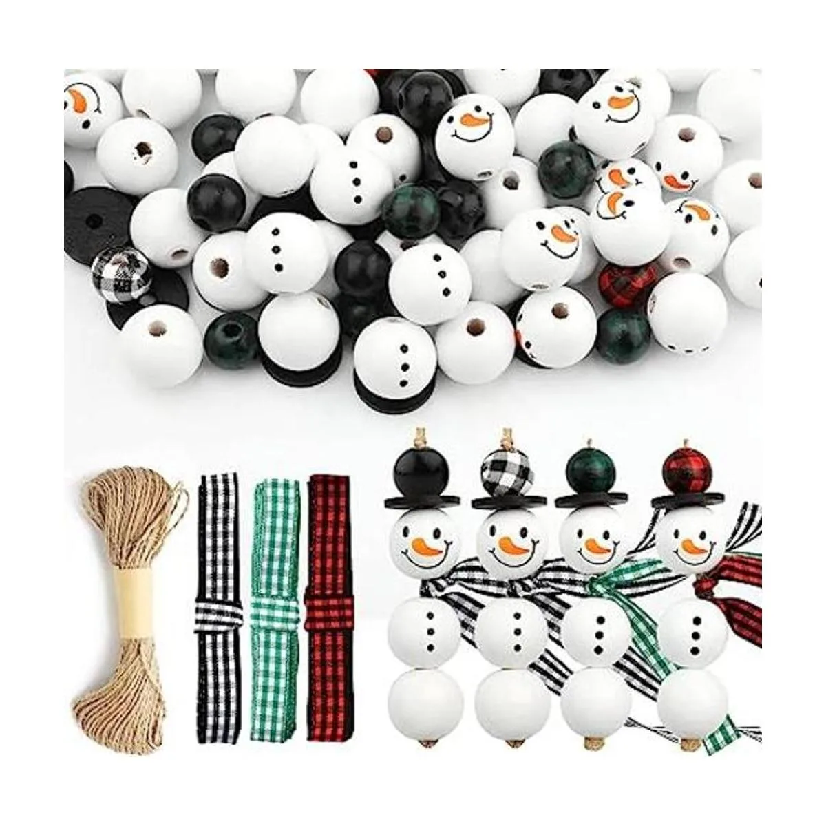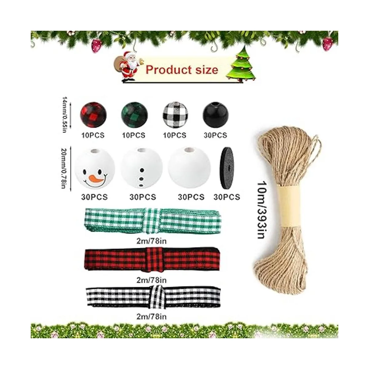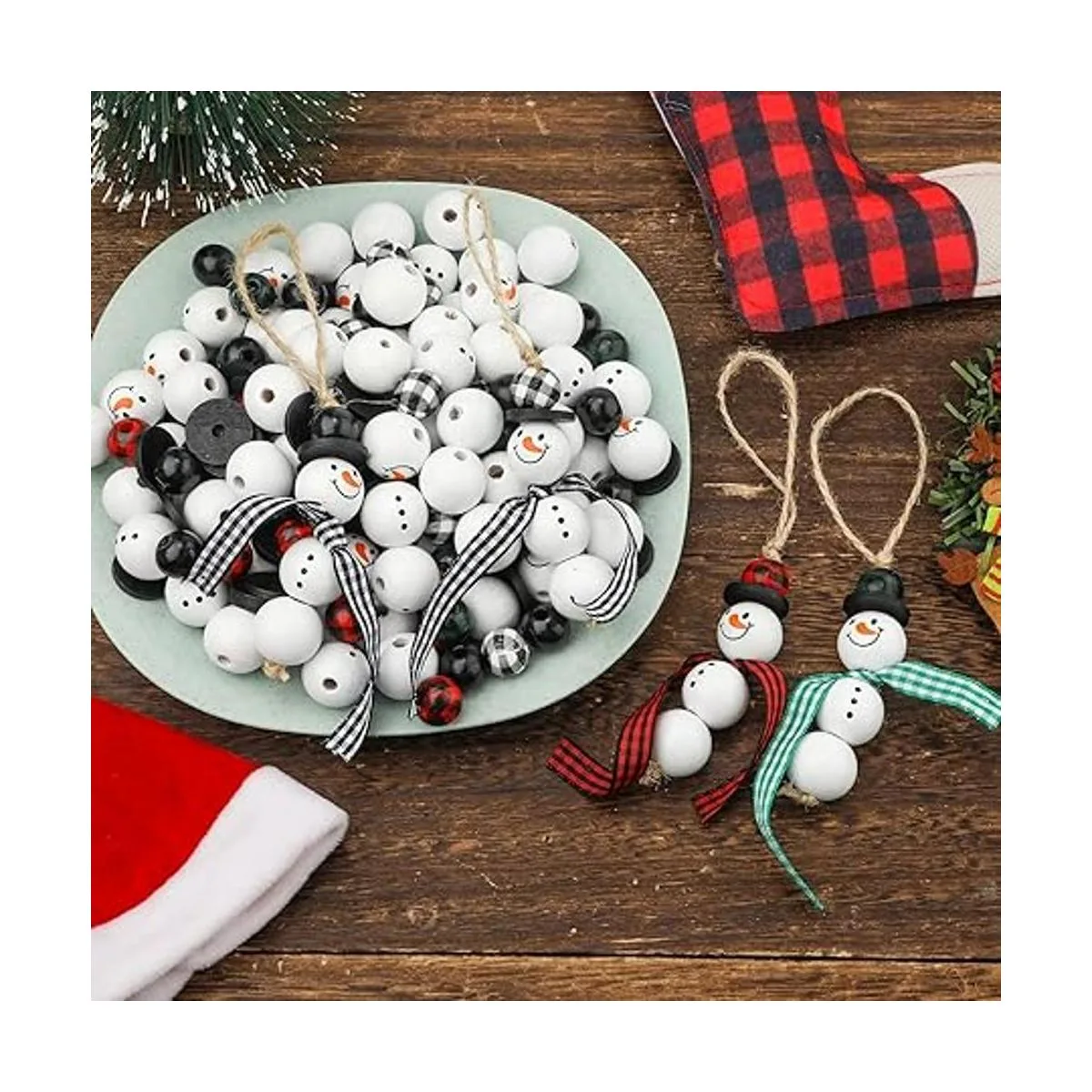 180 cuentas de madera de Navidad, muñeco de nieve de Navidad, cuentas de madera de búfalo de invierno, decoraciones de Navidad con estampado de búfalo, bufanda de cordel para manualidades, guirnalda de decoración de fiesta