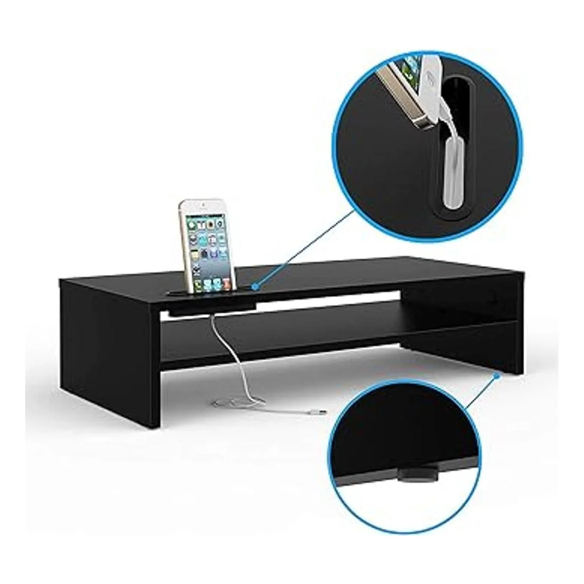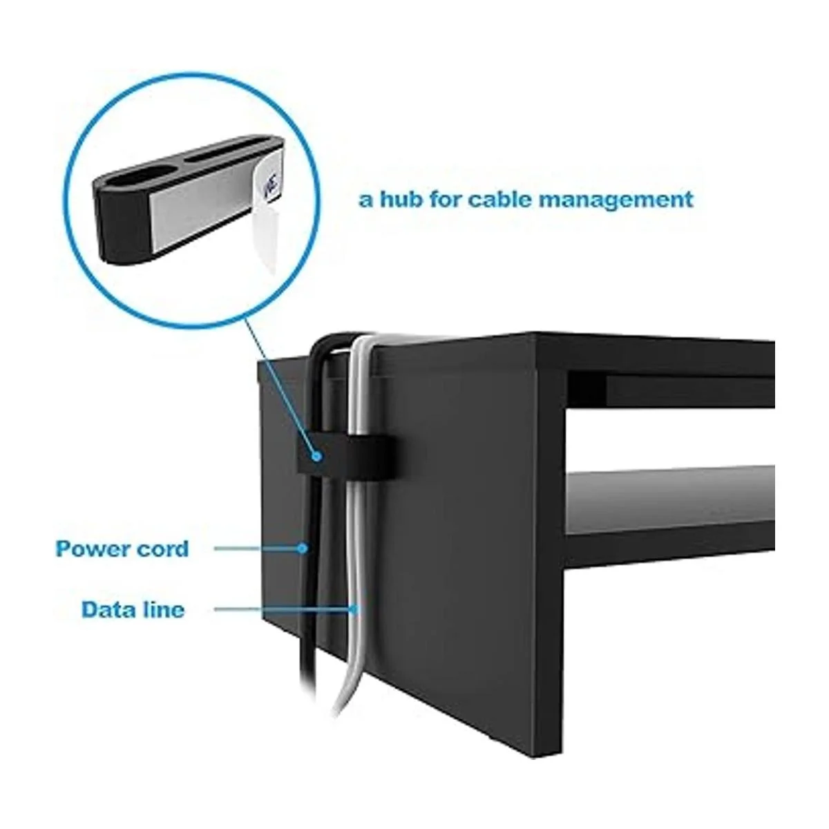 MONITOR RISER STAND WITH STORAGE ORGANIZER Our monitor stand rise comes with cable management slots that can make your cord stay organized. Cell phone holder will free your hands to make work easier. The monitor shelf provides enough area for storing laptops, keyboards, wireless mice, and daily necessities to keep your desktop tidy.
