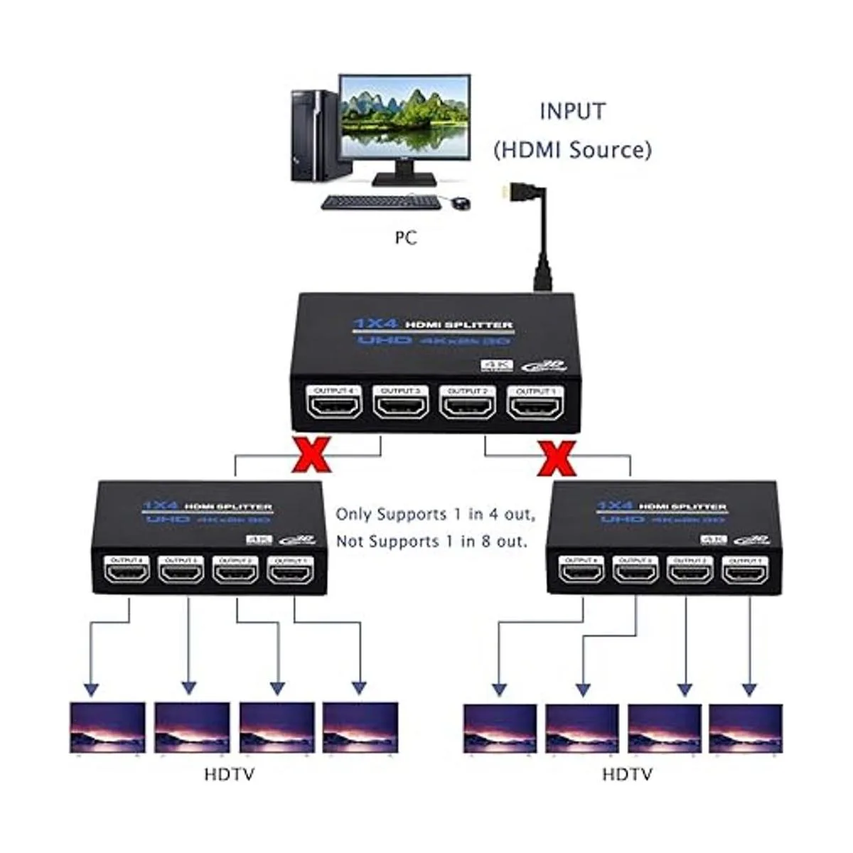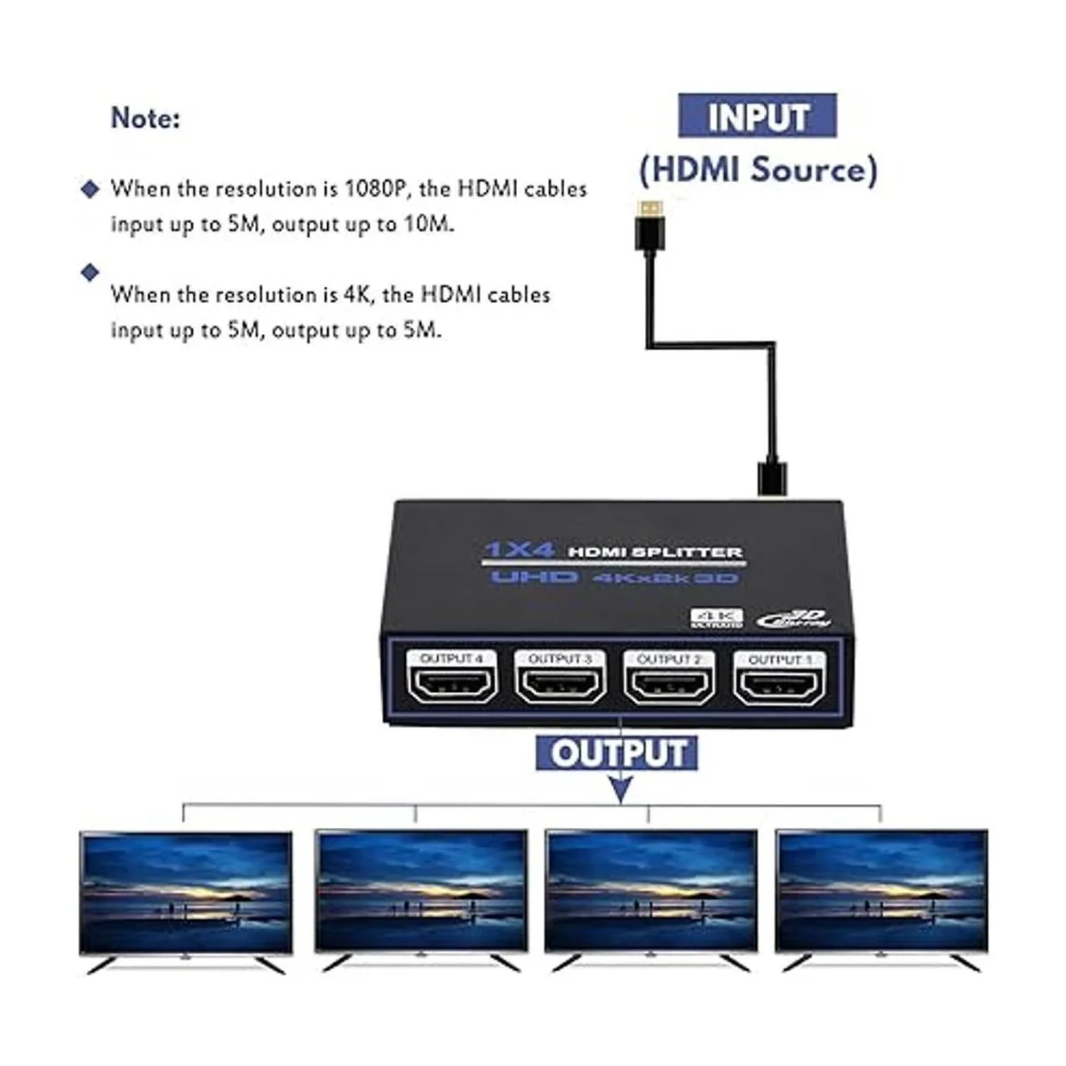 1×4 HDMI Splitter, 1 in 4 Out HDMI Splitter Audio Video Distributor Box Support 3D 4K x 2K Compatible for HDTV, STB, DVD, PS3, Projector Etc