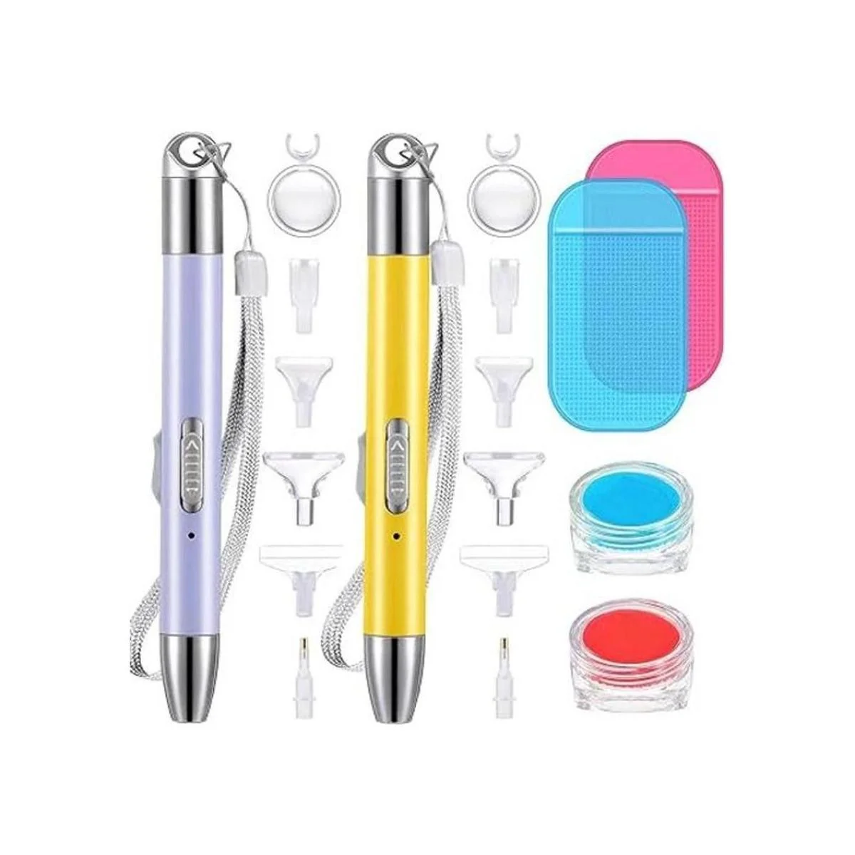 2 bolígrafos LED de pintura de diamantes, accesorios de pintura de diamantes, 12 cabezales de repuesto para bolígrafos, 2 alfombrillas antideslizantes, 2 cajas de almacenamiento organizadores de cera para herramientas de manualidades de pintura de bricolaje morado, amarillo
