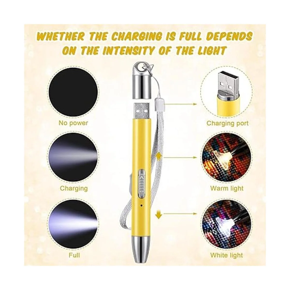 Práctica función de carga: este bolígrafo de pintura de diamantes 5D tiene luz brillante, simplemente conéctalo directamente a la fuente de alimentación móvil, adaptador, enchufe USB, es conveniente para cargar en cualquier momento y en cualquier lugar, la luz puede ayudarte a colocar el diamante en el lugar correcto, también puede reducir eficazmente la fatiga ocular