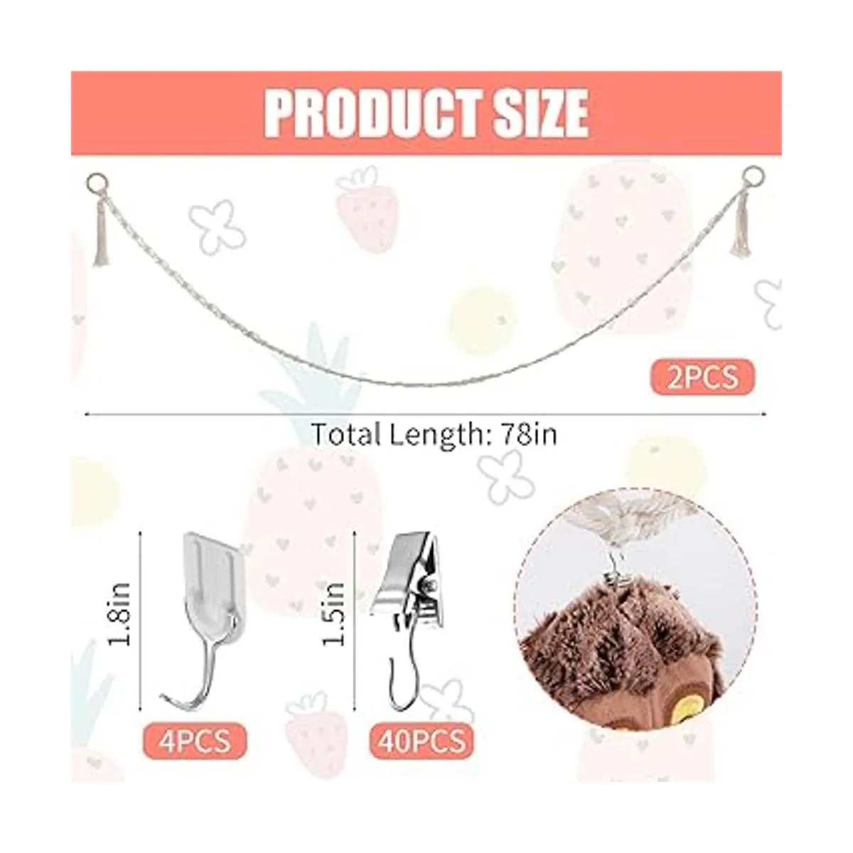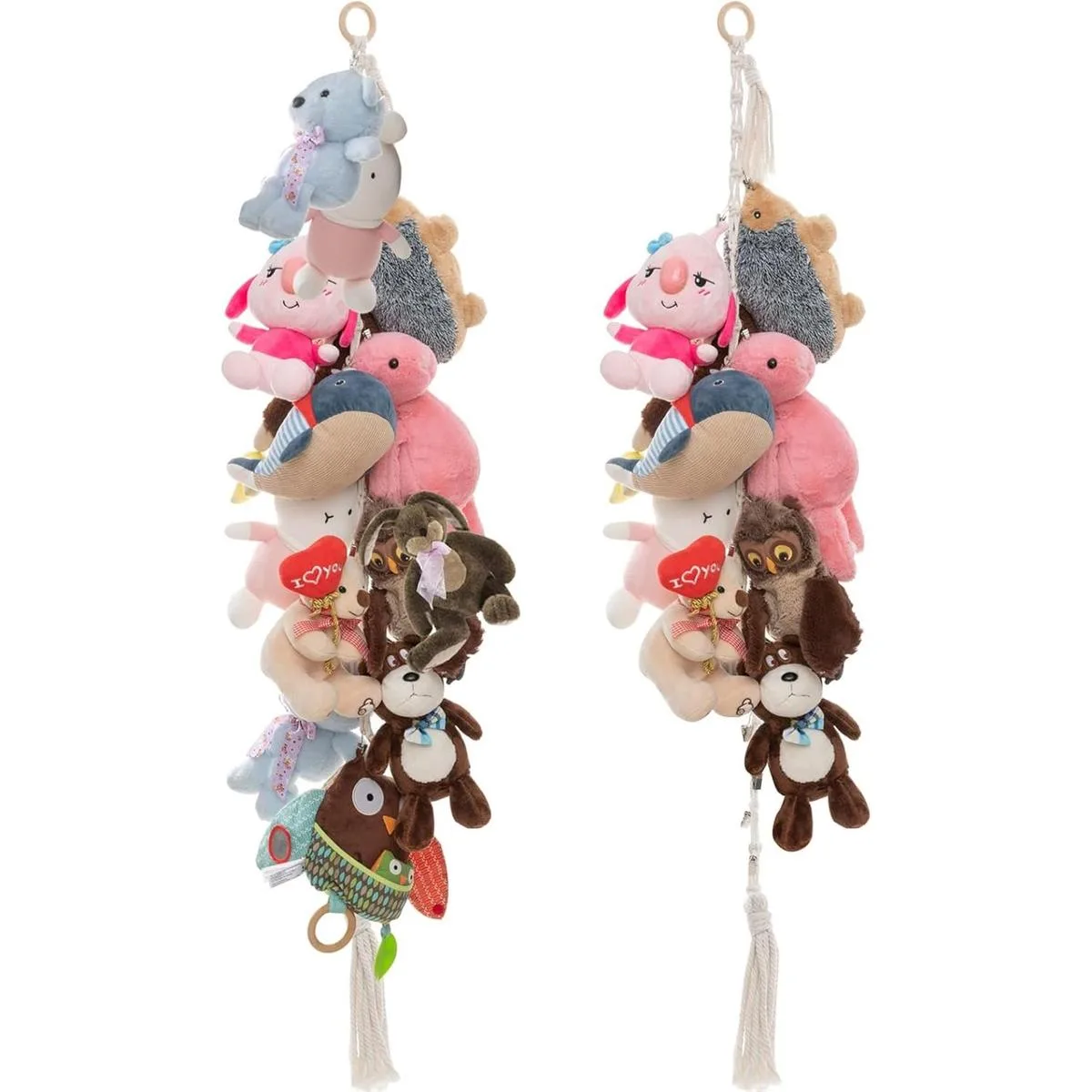 2 cadenas colgantes de algodón bohemio con animales de peluche, cadena de almacenamiento organizadora de juguetes fuertes de 78 pulgadas, cadena colgante hecha a mano con 40 clips y 4 ganchos de macramé, cadena de almacenamiento de juguetes de pared, decoración para juguetes, sombreros