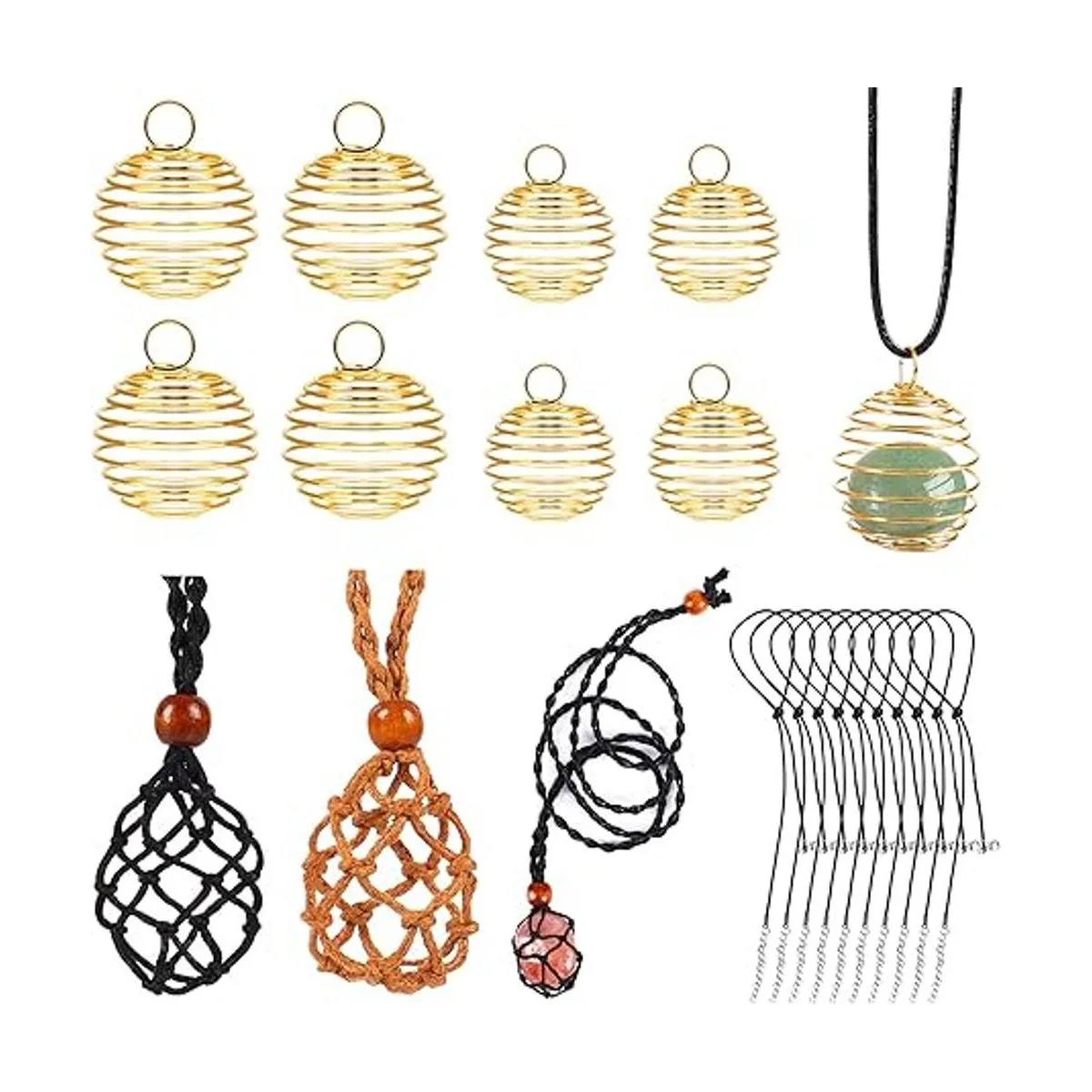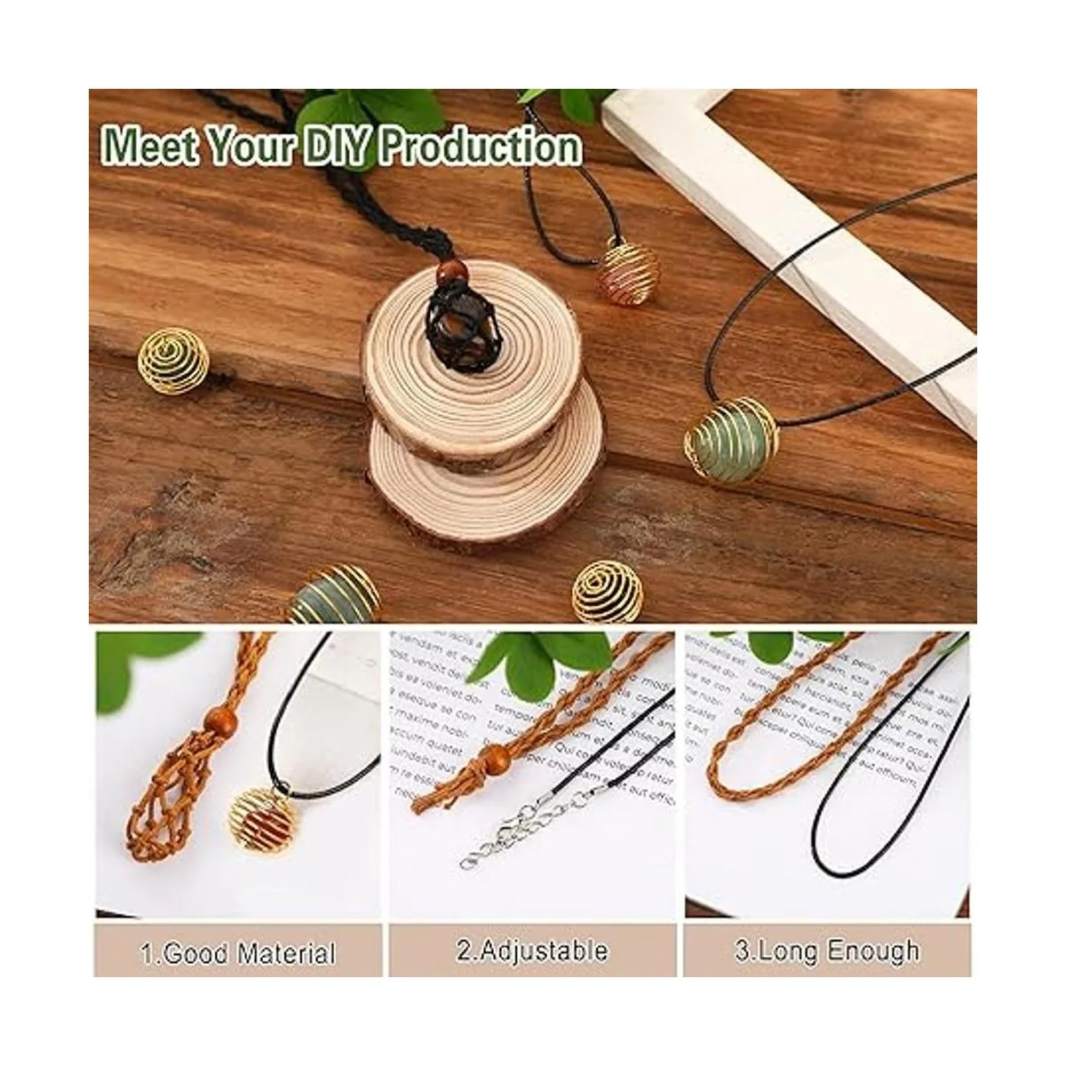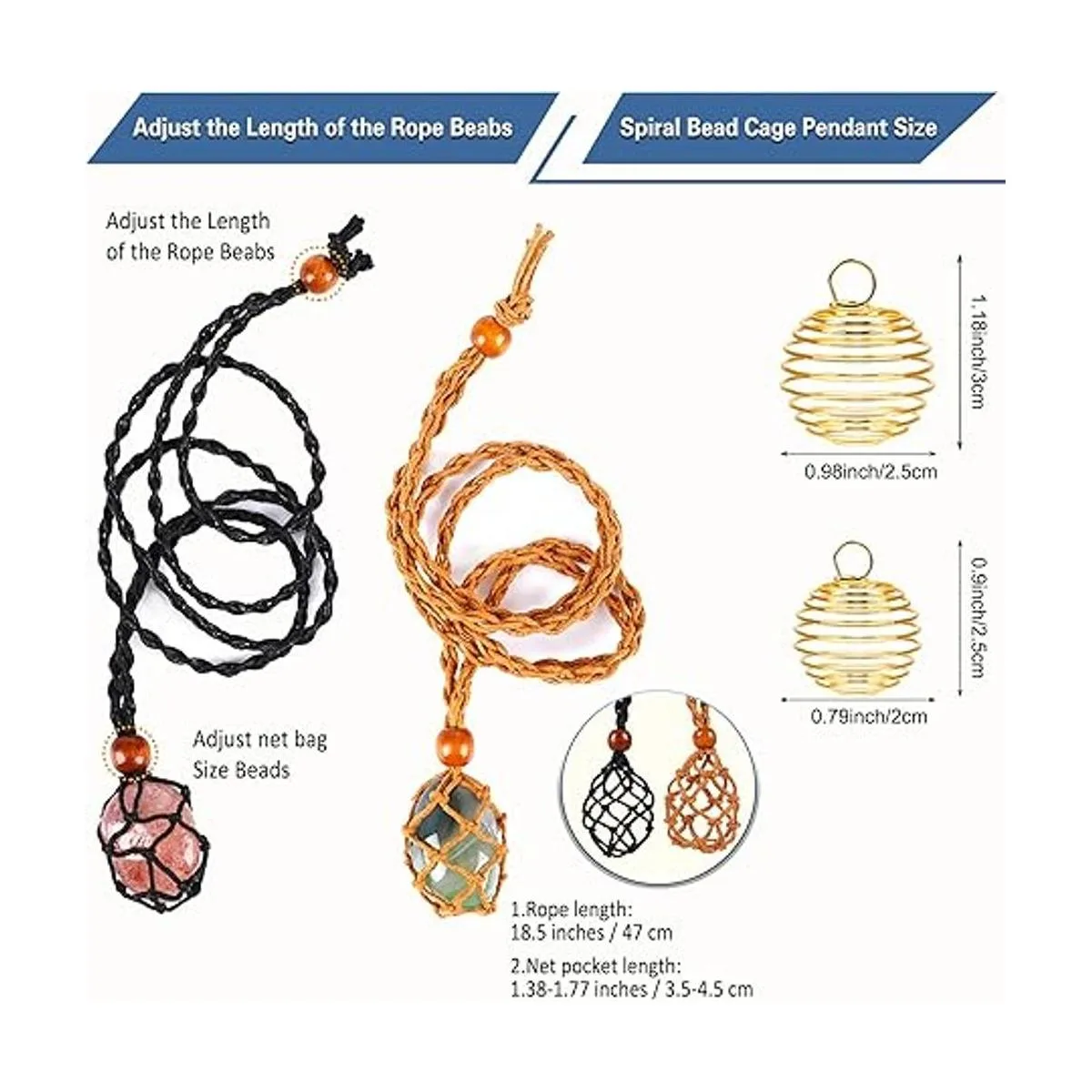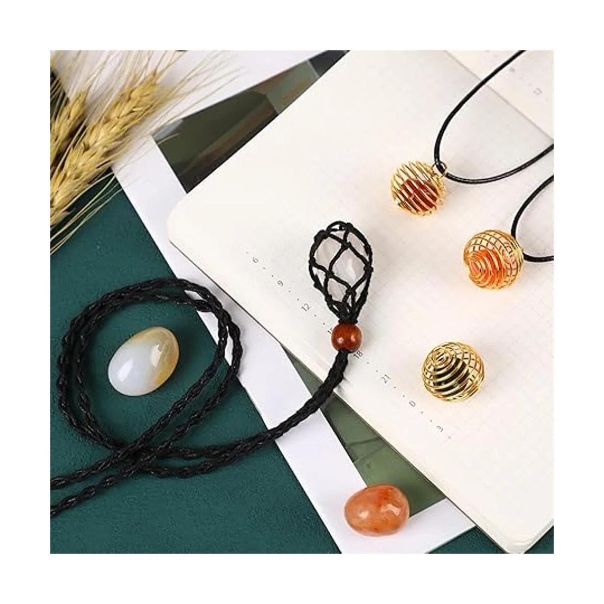 2 cuerdas de collar de cristal, soporte de piedra vacía, ajustable, tejido a mano, de cuarzo, con red, 8 jaulas de cuentas en espiral dorada, colgantes y 10 cuerdas de cera negra para manualidades de bricolaje dorado