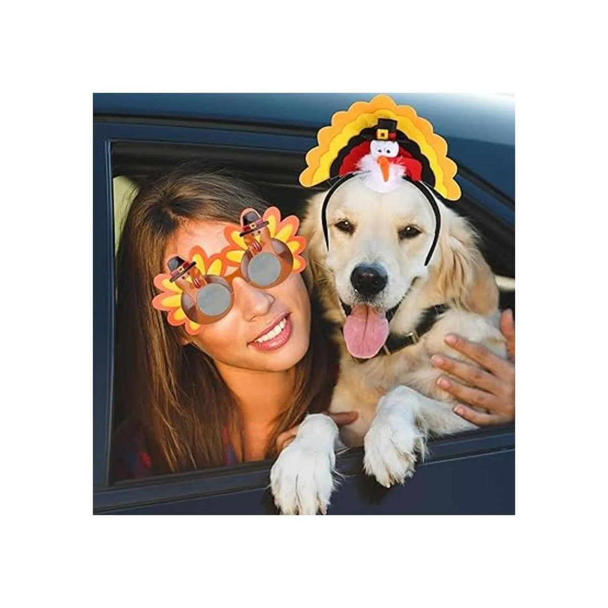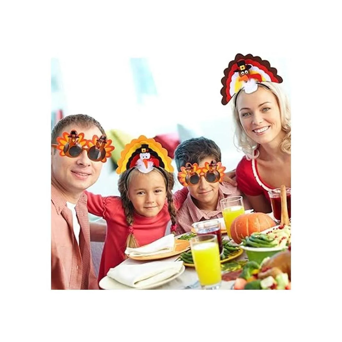 Tamaño: la diadema de pavo de Acción de Gracias mide 9.05 x 7.87 pulgadas, las gafas de sol de pavo miden 7.87 x 3.93 pulgadas largo x ancho, son adecuadas para la mayoría de las personas e incluso pueden ser usadas por tus mascotas.