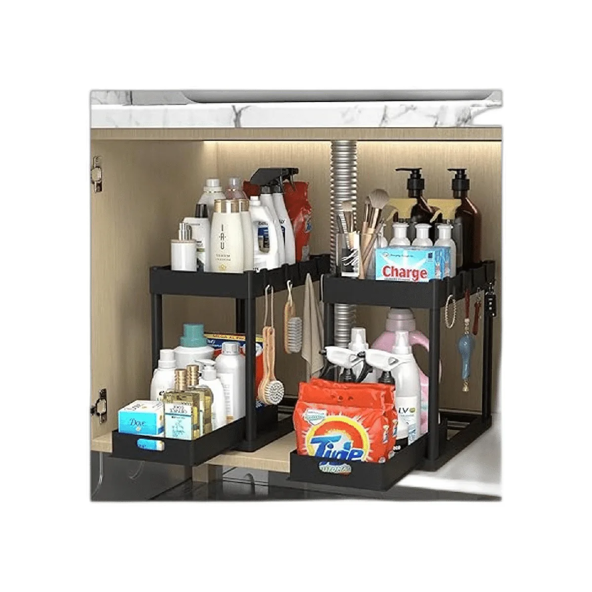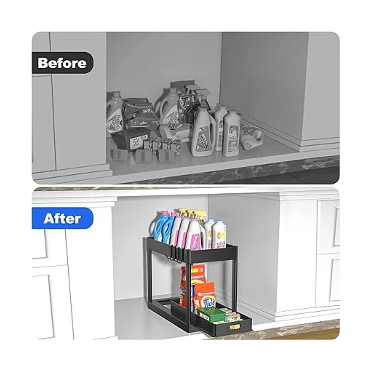 Ahorro de espacio: 2 capas de espacio de almacenamiento, los cajones deslizantes pueden colocar y sacar fácilmente la mayoría de detergentes y condimentos, no más agacharse para encontrar, ahorrar espacio y mantener tu hogar organizado.