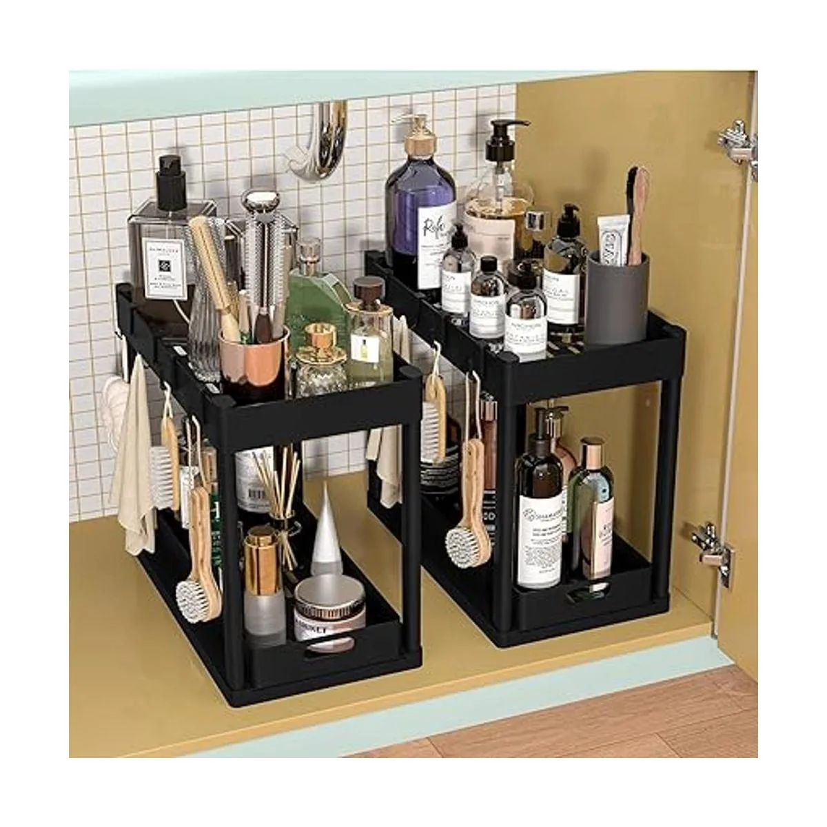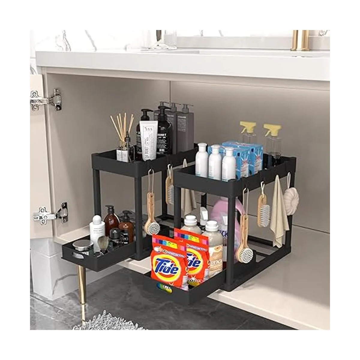 2 estantes organizadores debajo del fregadero, 2 niveles para debajo del fregadero, cesta organizadora con 4 ganchos, almacenamiento multiusos debajo del fregadero para baño, cocina, escritorio negro