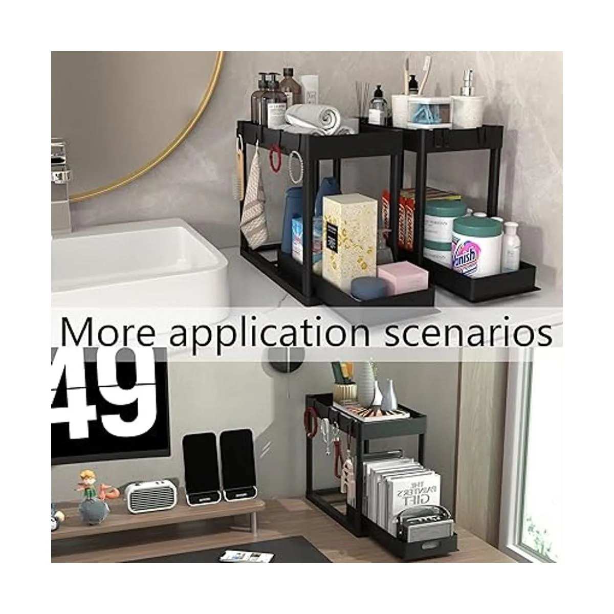 Organización y almacenamiento multiusos: el organizador de estante debajo del fregadero puede ahorrar espacio eficazmente y es fácil de mover. Adecuado para varios escenarios como cocina, baño, garaje, lavandería, oficina, etc.