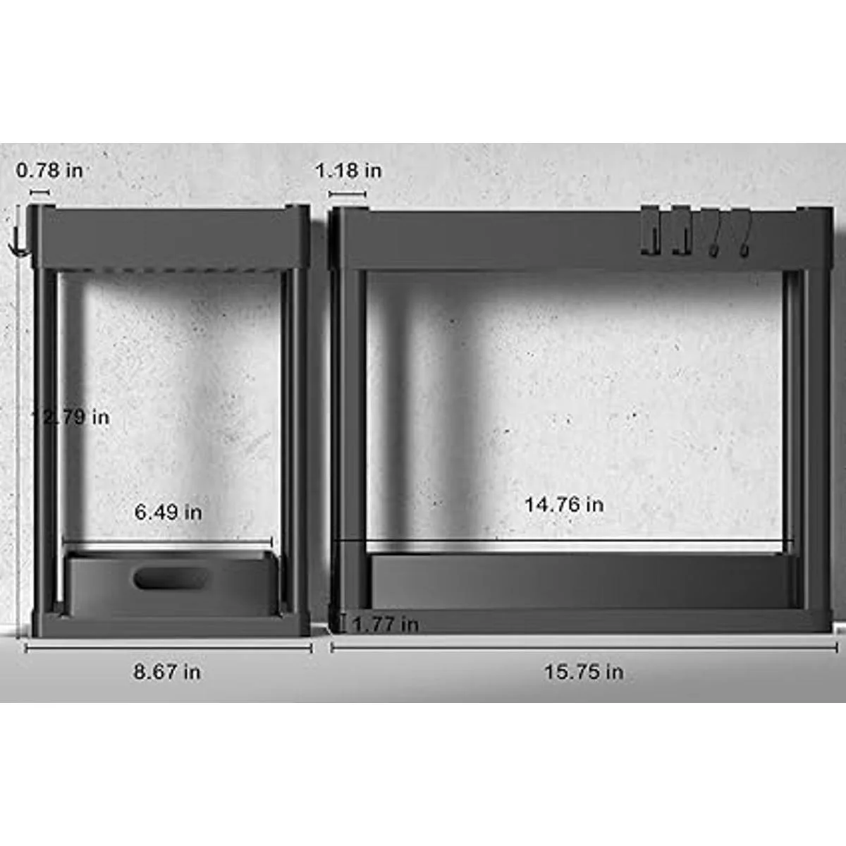 Fácil de instalar: el organizador de baño se puede instalar fácilmente sin necesidad de herramientas, el tamaño del producto es de 15.75 pulgadas de largo x 8.67 pulgadas de ancho x 12 pulgadas de alto. Equipado con 2 ganchos extraíbles para colgar objetos pequeños.