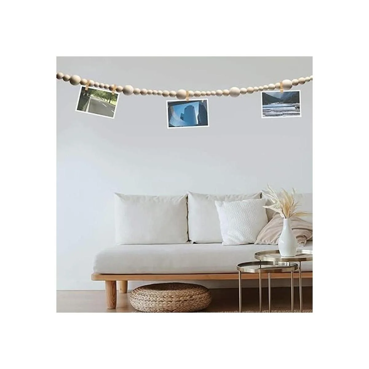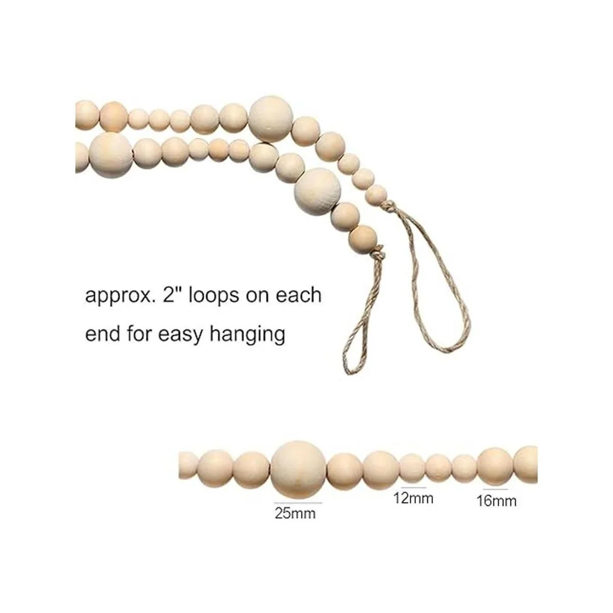 Tamaño: la guirnalda rústica de cuentas de madera mide aproximadamente 7.2 ft de largo, cuenta con 3 tamaños de cuentas diferentes: 0.5 in, 0.6 in y 1.0 in, adecuada para tu decoración diaria.