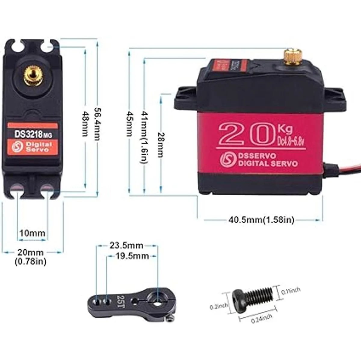 Lista de embalaje: 2 servos digitales DS3218MG de 180 grados, 2 bocinas de servo de 25T, 2 tornillos, 2 juegos de accesorios.